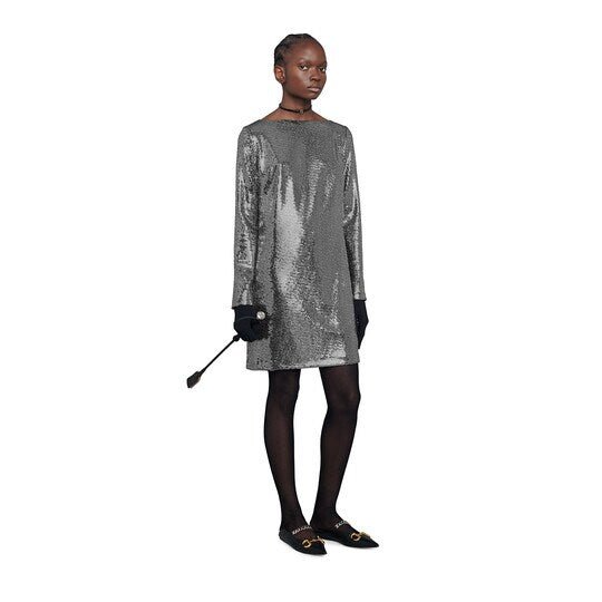 Imbued with a ’90s inspiration, the Gucci Metallic Dotted Jersey Dress has a sparkling appearance. The boat neck design is embellished with a patent leather strap with Square G buckle, a recurring detail of the Spring Summer 2020 collection.
