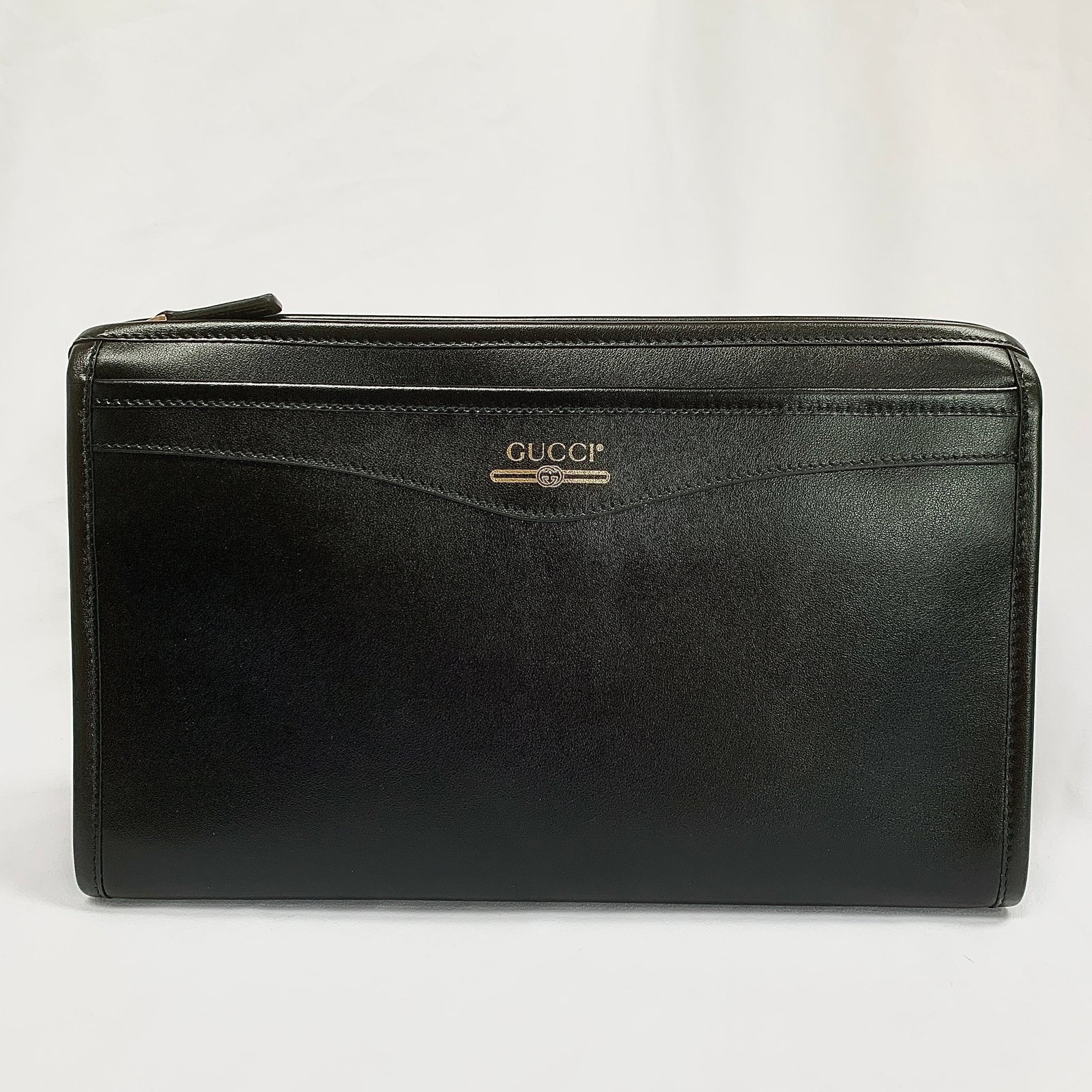 The Gucci Metallic Print Logo Smooth Leather Clutch in Black is crafted in Italy from a supple calfskin leather. This cosmetic bag features a metallic vintage printed Gucci logo on the front. A magnetic closure slip pocket sits at the front, while the top zip opens to one zipped pocket. We love this piece as a cosmetic pouch or chic clutch!