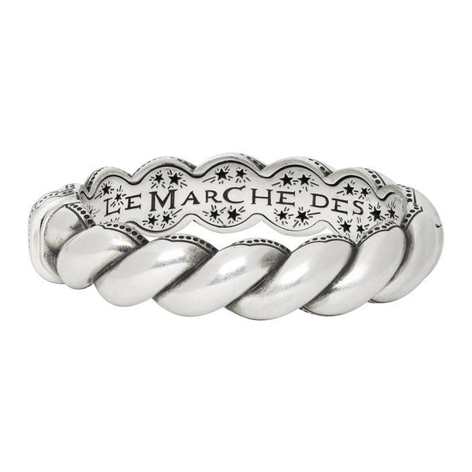The Gucci Metallic Twisted Garden Bracelet in Silver is crafted from a solid, aged sterling silver in Italy. This hinge style bracelet features a twisted rope design on the outside framed by dots and a GG logo. It opens to a star design on the inside with the words ‘Merveilles’ and ‘Le Marche Des’.