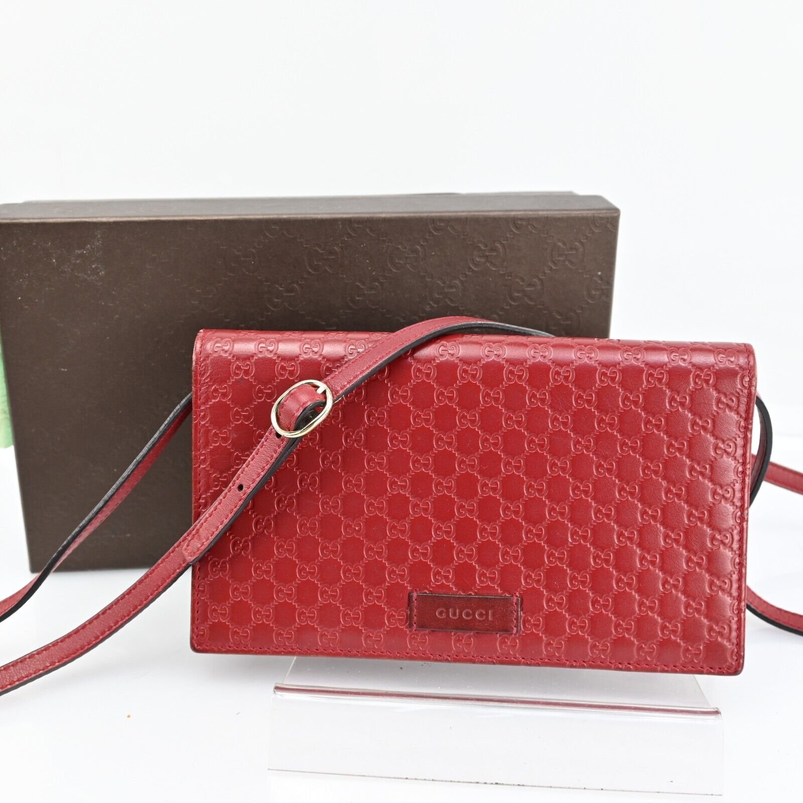 Make a bold statement with the Auth Gucci Micro Guccissima Leather Crossbody Bag in red, a must-have accessory for those who appreciate luxury and style. Elevate your look with this iconic piece that exudes class and sophistication, perfect for adding a touch of glamour to any ensemble.
