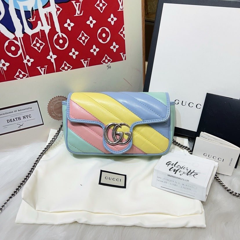 This preloved Gucci Mini Marmont Pastel Shoulder Bag is a striking example of luxury craftsmanship. Made from premium leather, its chic multicolored chevron pattern brings a playful yet elegant touch. The silver chain strap provides versatility, allowing it to be worn as a shoulder or crossbody bag. Inside, the satin lining complements the sleek exterior and includes practical compartments for convenience. Ideal for collectors or fashion enthusiasts alike, this piece is a standout among used designer handbags and perfect for those seeking vintage Gucci bags.