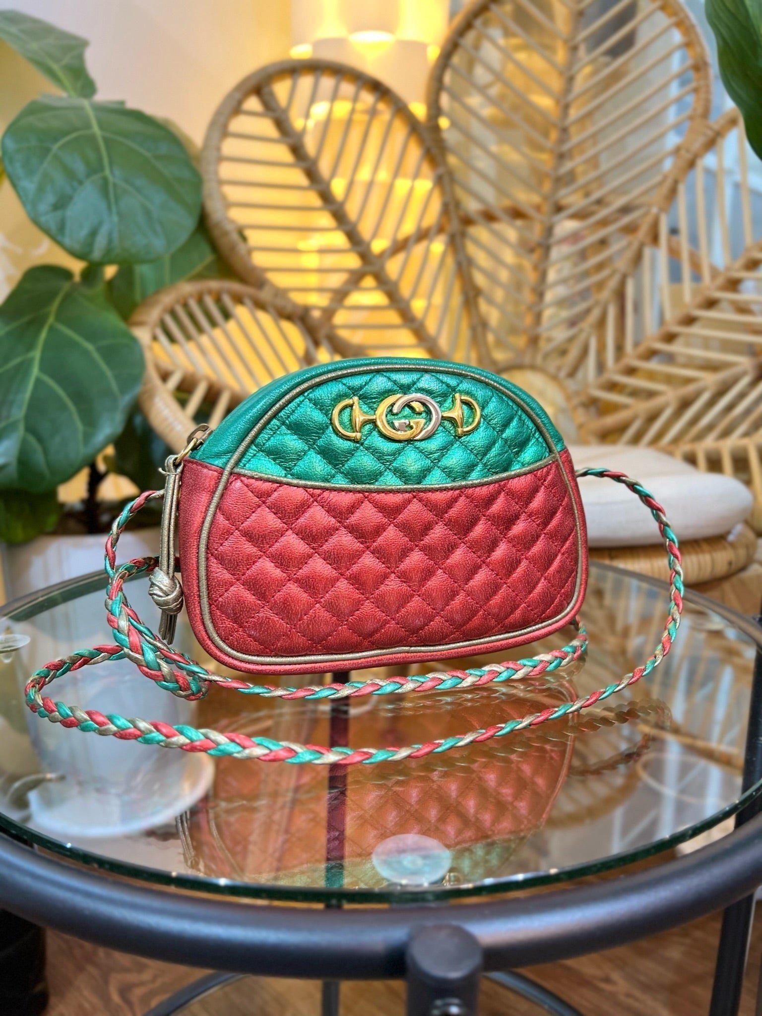 The Trapuntata features a quilted metallic leather body, a braided leather strap, a top zip closure, an exterior front slip pocket, and an interior slip pocket. It carries a B+ condition rating.