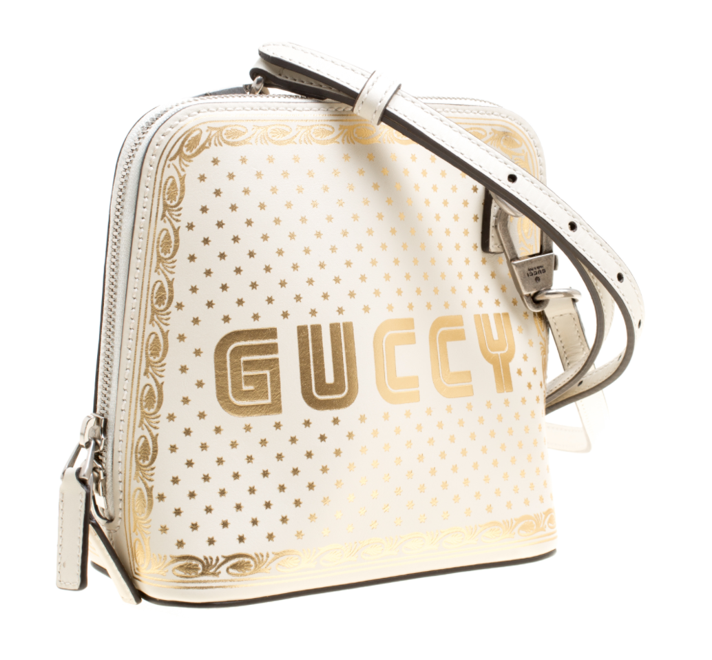 The Gucci Moon & Stars Mini Guccy Shoulder Bag in Steller White is crafted of a smooth, off-white calfskin leather in Italy. This dome shaped bag features a metallic gold ‘GUCCY’ logo surrounded by stars and a swirling design, removable and adjustable shoulder straps, and a baby blue interior.