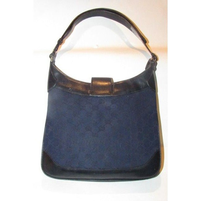 For sale is a unique, mod, Gucci, navy Guccissima print canvas and black leather, vintage, ‘1973’ style, top handle shoulder bag with a bold gold GG accent on flap snap closure, two strap lengths, and an expandable, accordion bottom! It is an unusual vintage style that Gucci has re-released similar versions of in its 1973 line; This would be a great used as your signature navy purse!