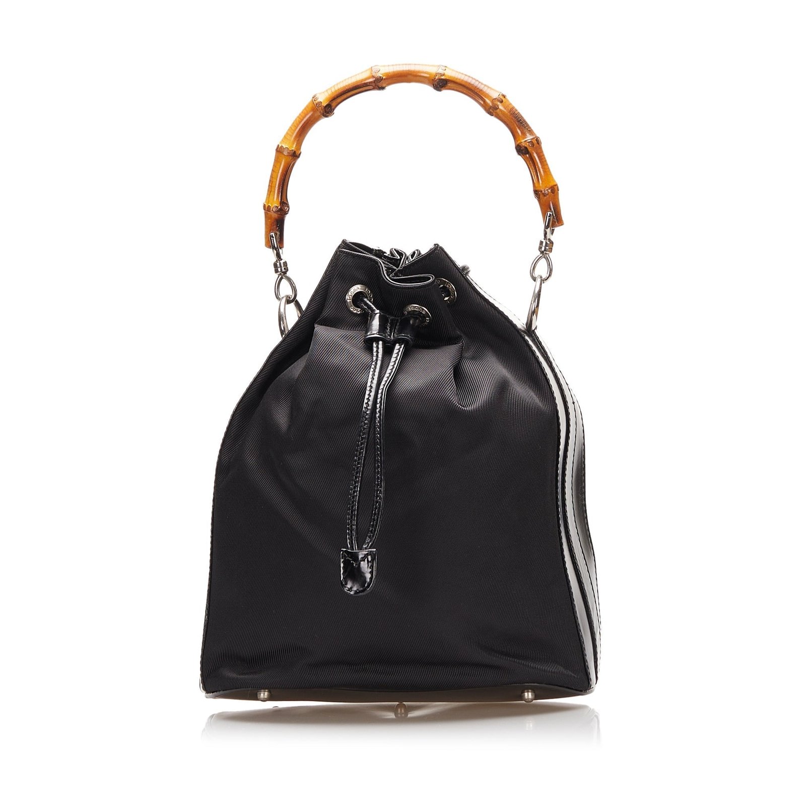 This bucket bag features nylon body, a bamboo top handle, a detachable strap, a drawstring closure, and an interior zip pocket. Comes with dust bag