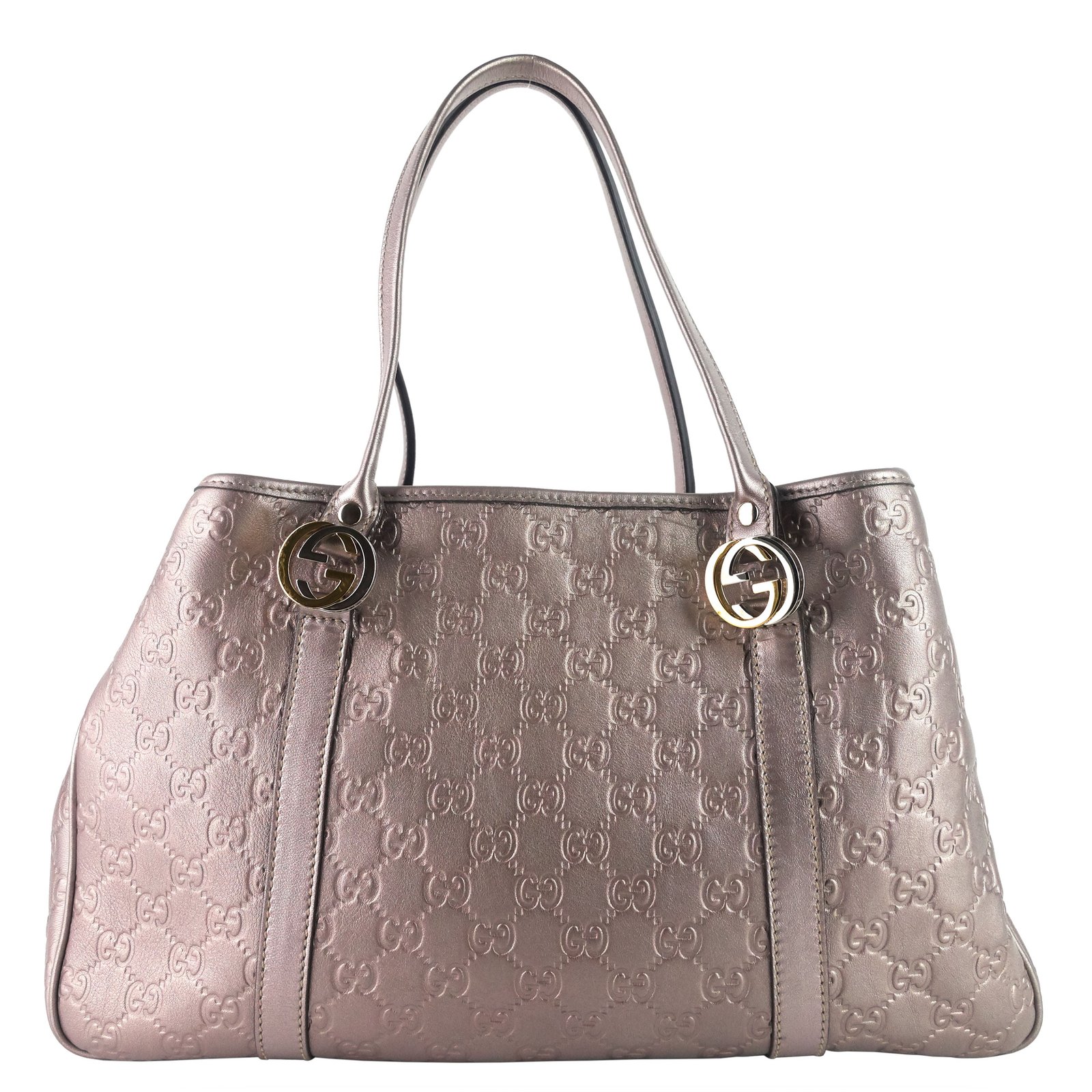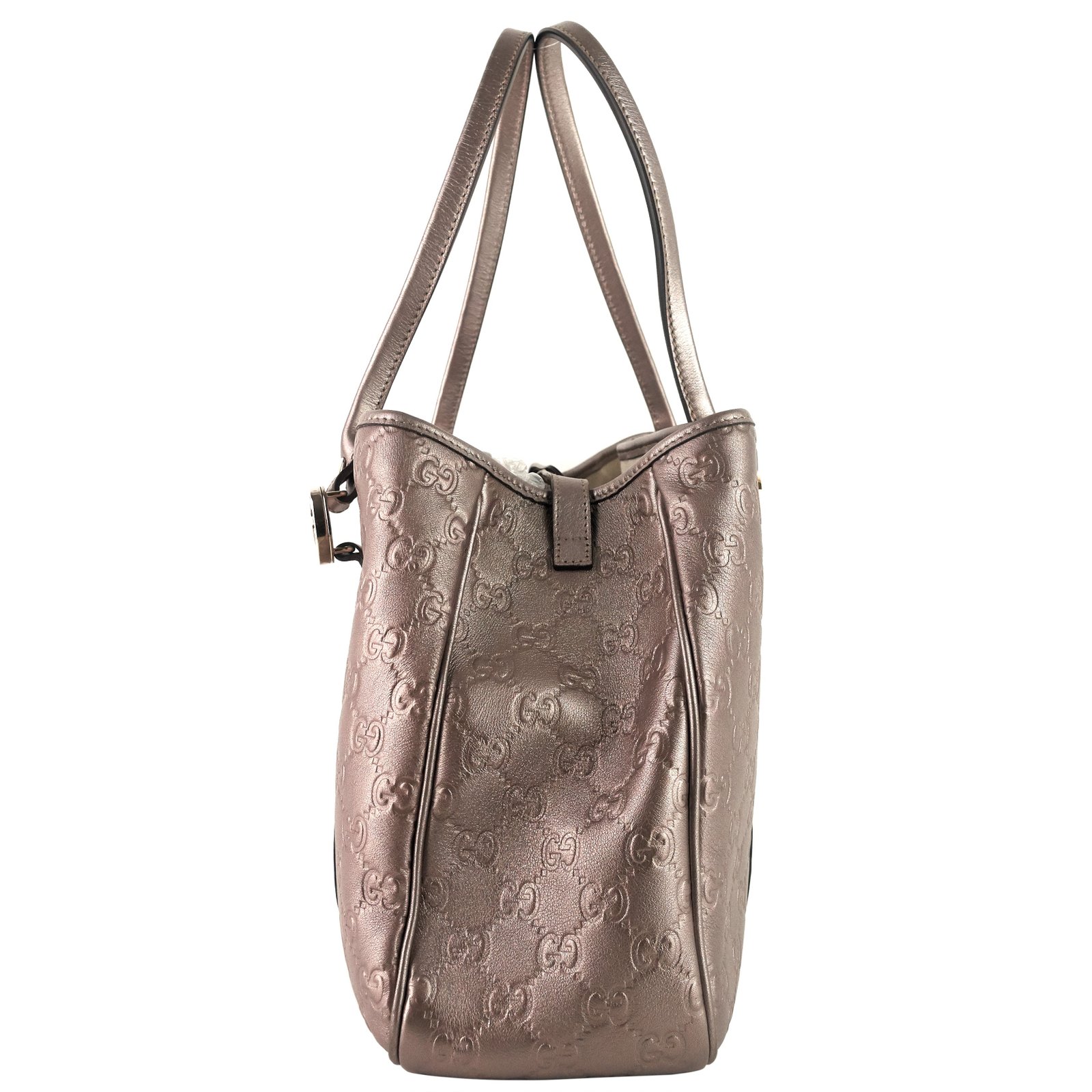Double-G logo debossing textures the metallic calfskin leather of a chic tote bag crafted with a generously spacious interior that is sure to accommodate all of your everyday essentials with ease.