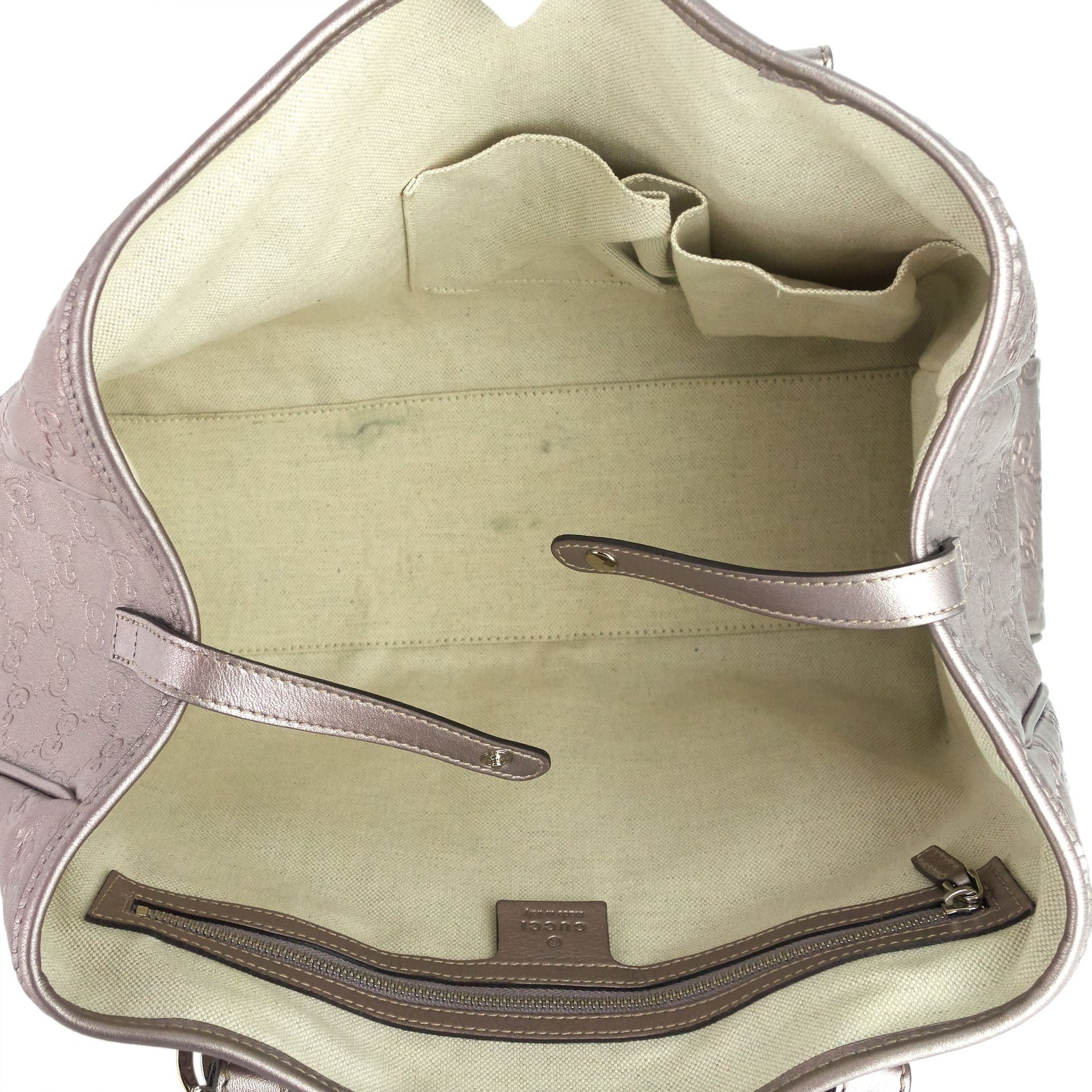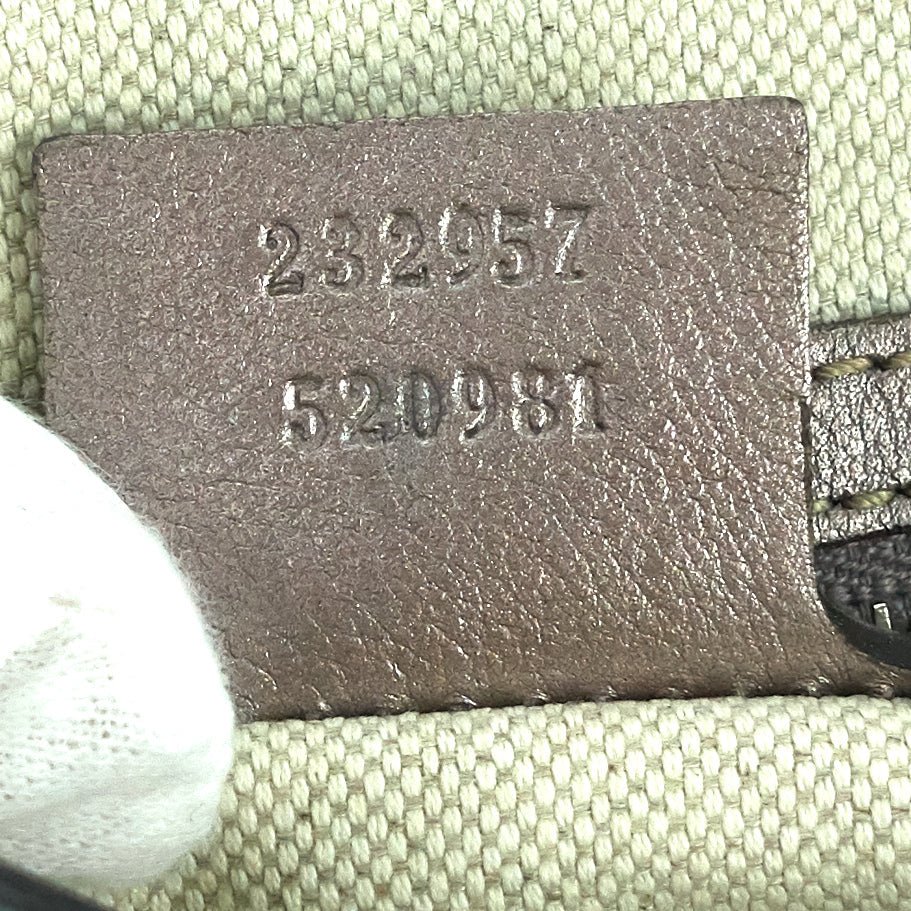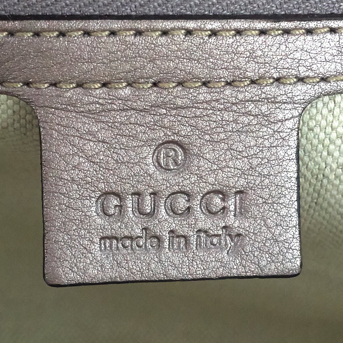 Overall: The exterior leather is in excellent condition without any noticeable wear. The interior lining is in good condition with faint but noticeable staining throughout. The hardware is bright and shiny with some light scratching to the tips of the bottom studs and double-G strap anchors.