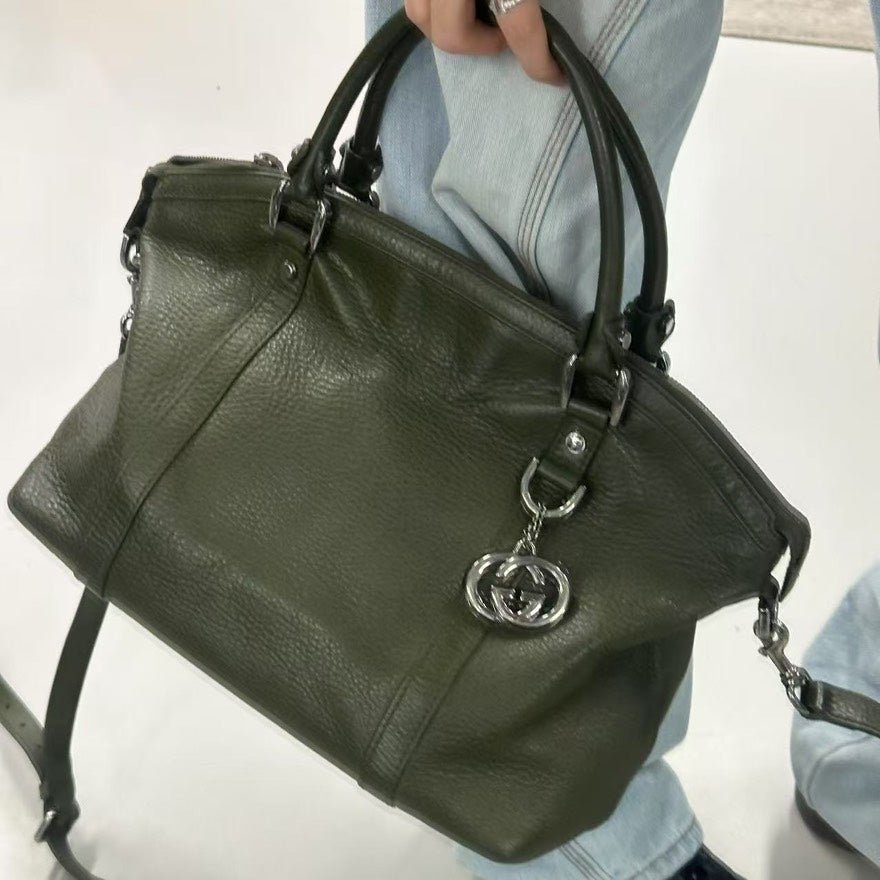 This preloved Gucci olive green leather shoulder bag is a stylish accessory for any occasion. The structured yet supple silhouette is designed with high-quality leather, adorned with the classic silver GG logo charm. It features a comfortable shoulder strap and an optional crossbody strap, offering versatility in wear. While there are minor signs of wear, this bag is in very good condition and is a standout piece among vintage Gucci bags. Perfect for those who appreciate luxury and elegance, it is a prime example of used designer handbags.
