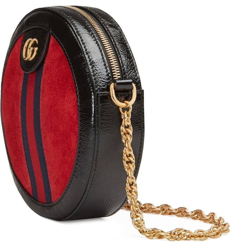The world of Ophidia evolves with the introduction of a round mini bag with a chain shoulder strap. Crafted in red suede and patent leather with inlaid blue and red Web stripe, the accessory is enhanced by a petite play on the Double G, an archival Gucci code from the ’70s that appears atop a tab detail and on the zipper pull.