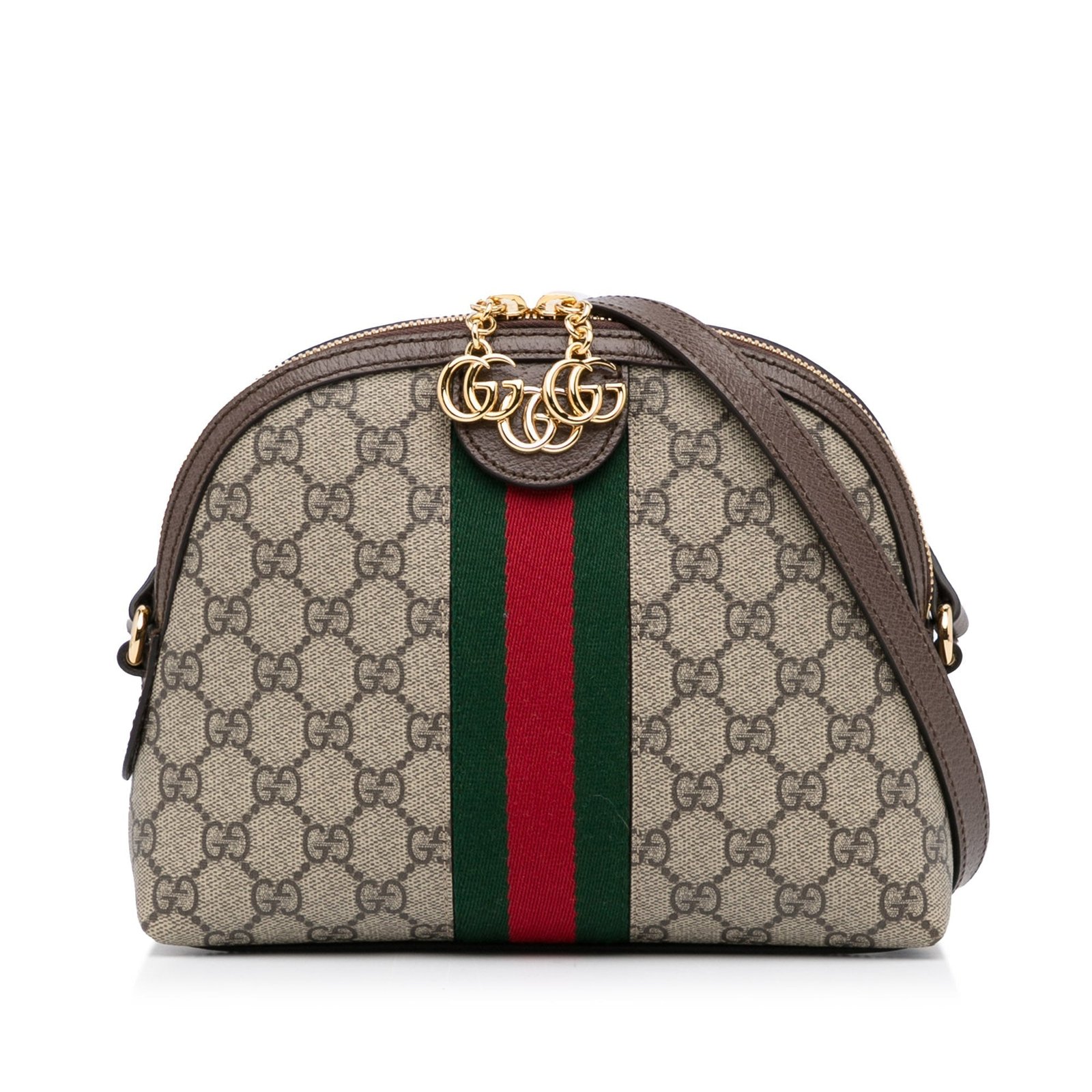 This stunning Gucci Ophidia Bag is made of GG Supreme canvas with woven stripes incorporated, and has a curved shape reminiscent of vintage designs. The gold-tone double G – an archival code – is seen on a leather tab and on the zipper. It is best across the body or loosely over the shoulder.