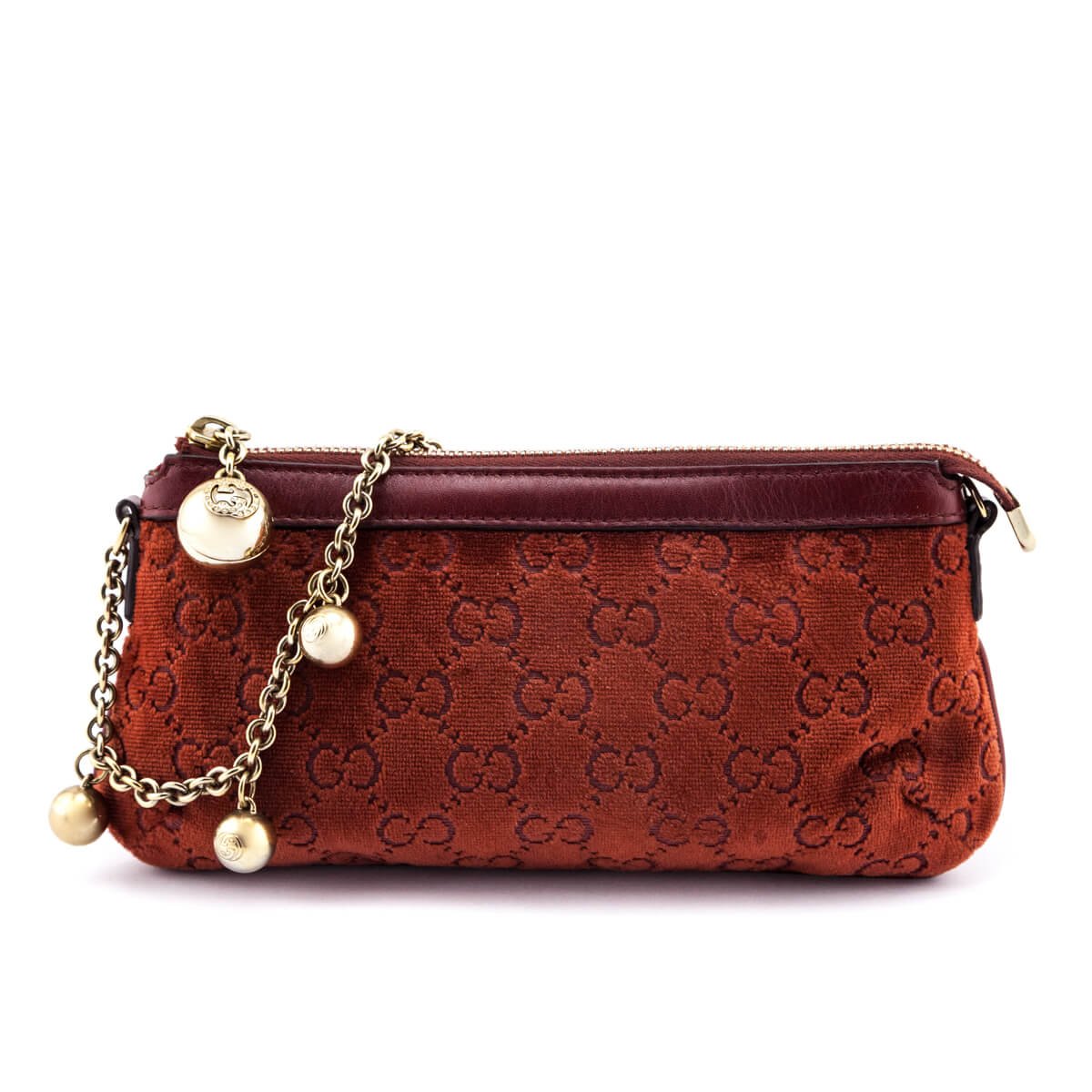 A chic design with a ’70s reminisce, this Gucci Orange Velvet GG Monogram Pochette is your next statement pick! A rust-hued velvet exterior is debossed with the classic GG print throughout, accented by rich burgundy leather trim, and aged gold-tone hardware. The compact E/W silhouette features a top zip closure with an oversized rounded ornament with a crystal GG logo as the zipper-pull, and a top handle/short shoulder chain strap with mini GG etched ornaments. Inside, a tonal satin-like fabric lining offers one open slip pocket. Pair this Gucci bag with a creamy cashmere knit deep v-neck sweater, flared denim, and a chocolate brown squared-toe boot for the ultimate retro look!