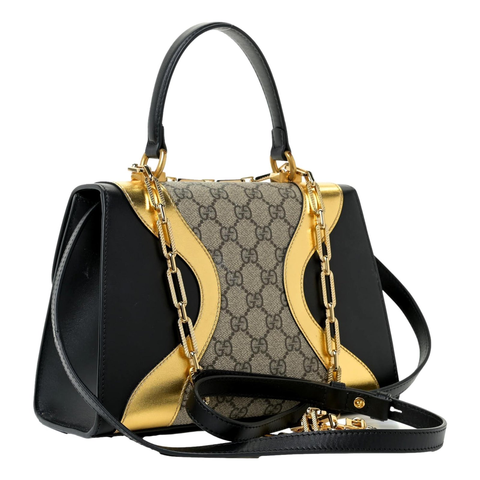 The Gucci Osiride Monogram Top Handle Bag is luxury personified with a black and gold color palette. Designed with royalty and luxury in mind combined with mixed elements this unique handbag will turn many a head. Crafted in the iconic GG supreme canvas with bold calfskin leather details and features antique gold-tone hardware, lined interior with a slip pocket and zipper pocket, two adjustable shoulder straps, front flap with push lock closure and iconic tiger head detail on front closure. This beautiful Gucci Osiride Monogram Top Handle Bag won’t last long.