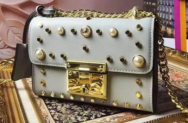A small structured chain shoulder bag has our key lock closure pulled straight from the archives, the key is placed in a leather key case. The bag is further enhanced by gold-tone studs and GG pearl studs carefully placed.