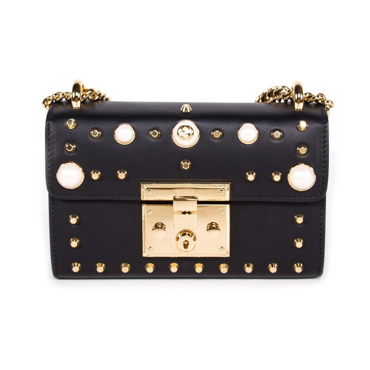 Details: Black Smooth Leather / Gold-Tone Hardware / Chain Shoulder Strap / Gold-Tone Studs and Glass GG Pearl Studs Embellishments at Front and Back /Beige Suede Lining / Single Compartment and Slit Pocket At Interior / Push-Button Closure at Front Flap
