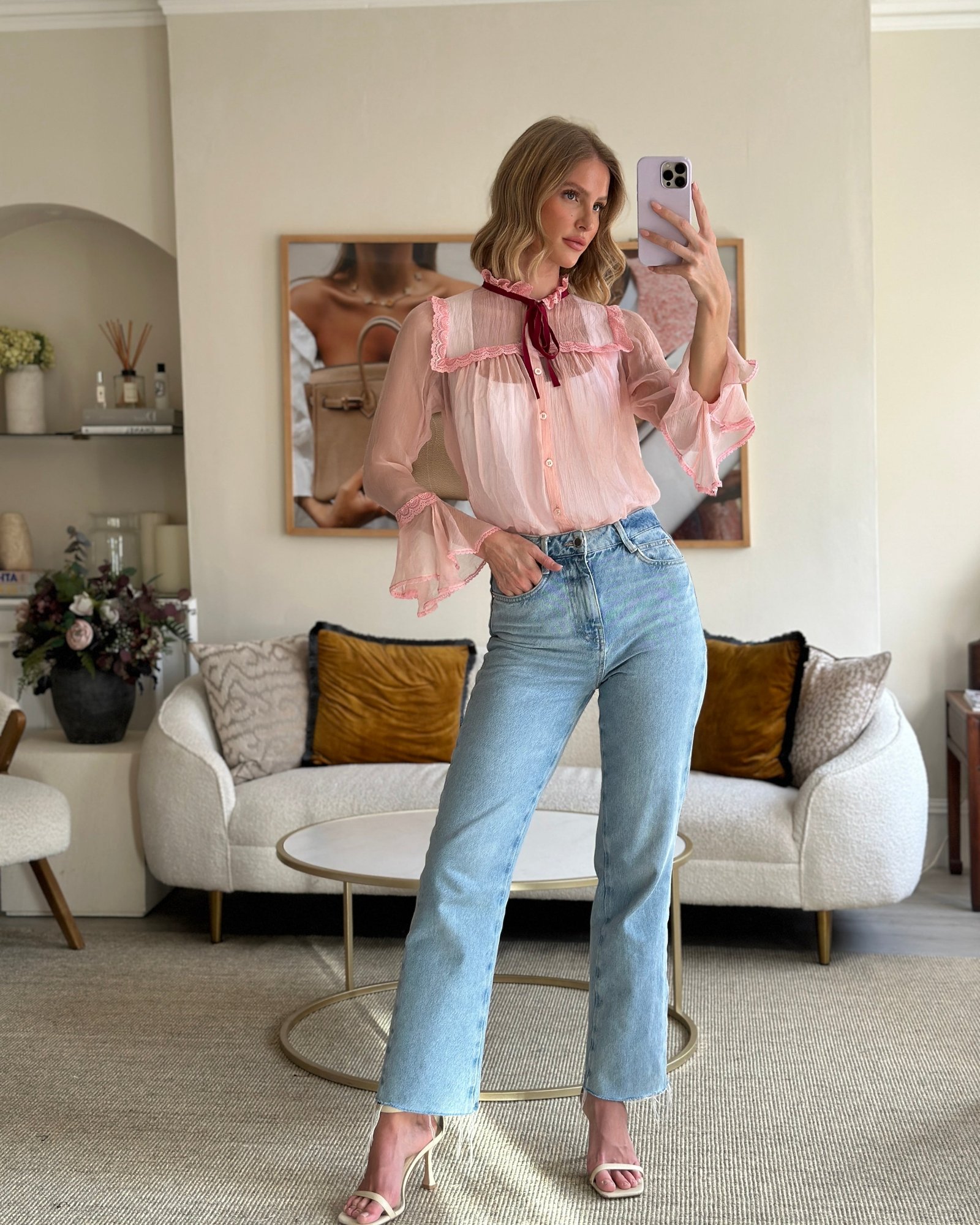 Gucci Pink Silk Pearl Button Down Shirt with Crochet Trim Detailing IT 36 (UK 4)