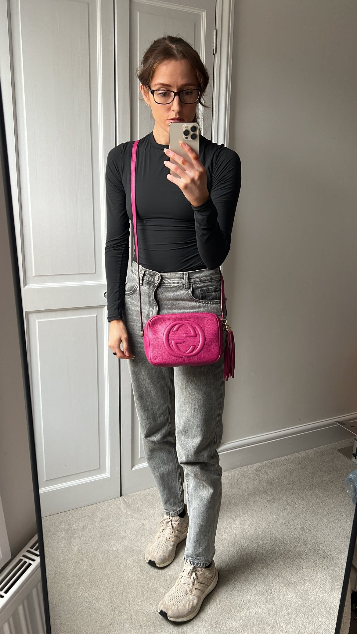 Gucci Soho Disco in Pink Leather with pale gold hardware. This practical, cross body, camera style bag is compact in size but still fits a reasonable amount. Can be worn over shoulder or cross body. Gucci’s most popular style and goes with any outfit, dressed up or down. This pink shade is rare and does not come up preloved often.