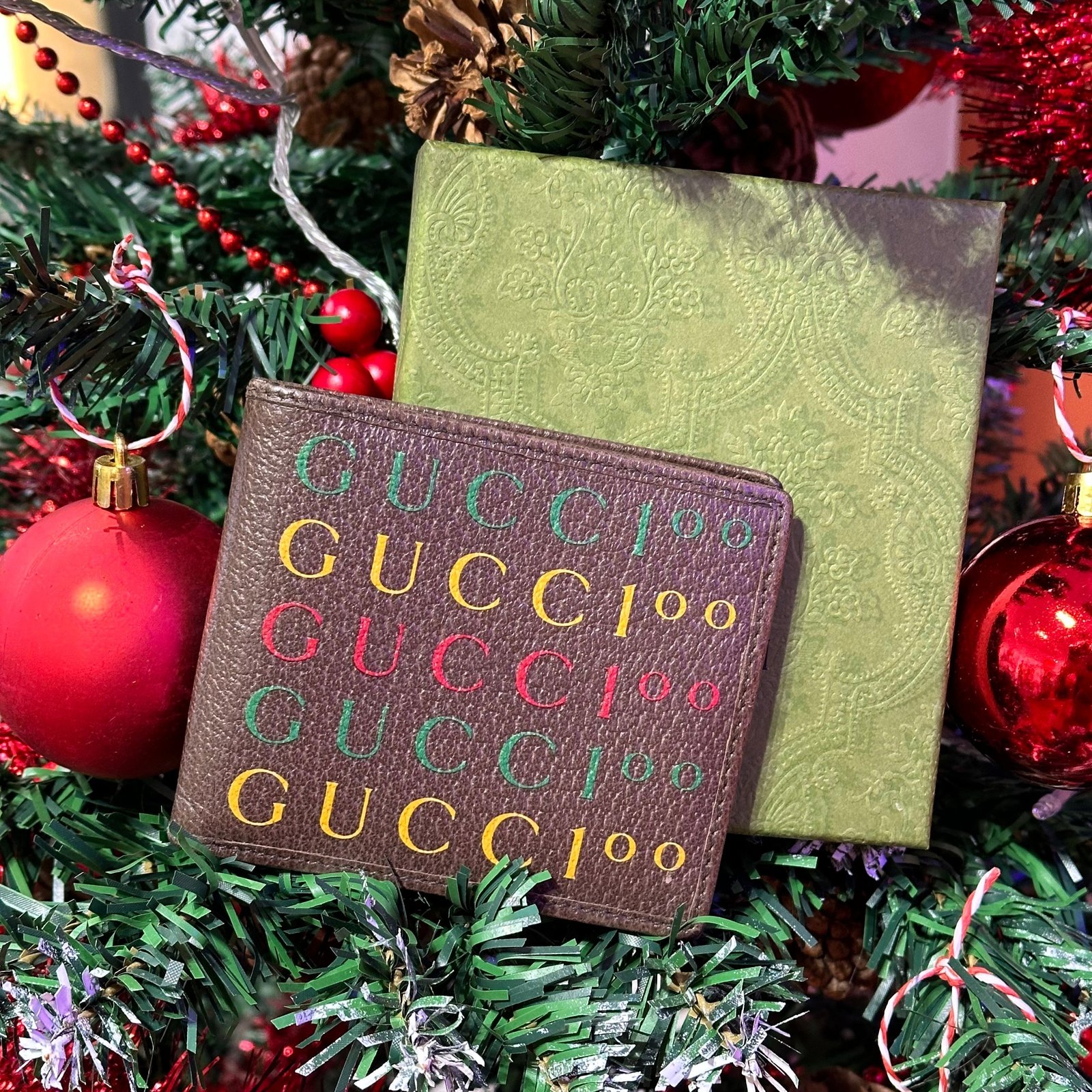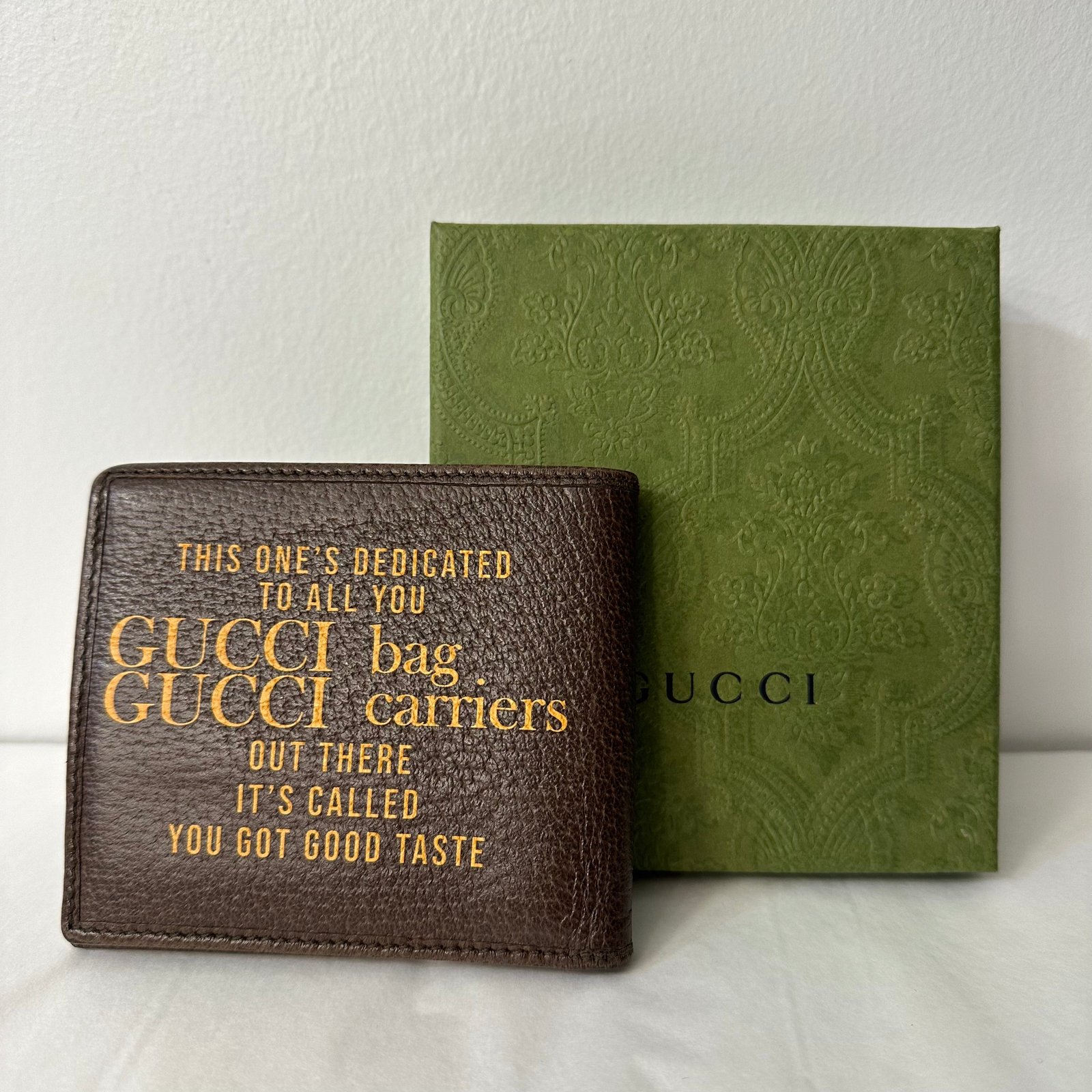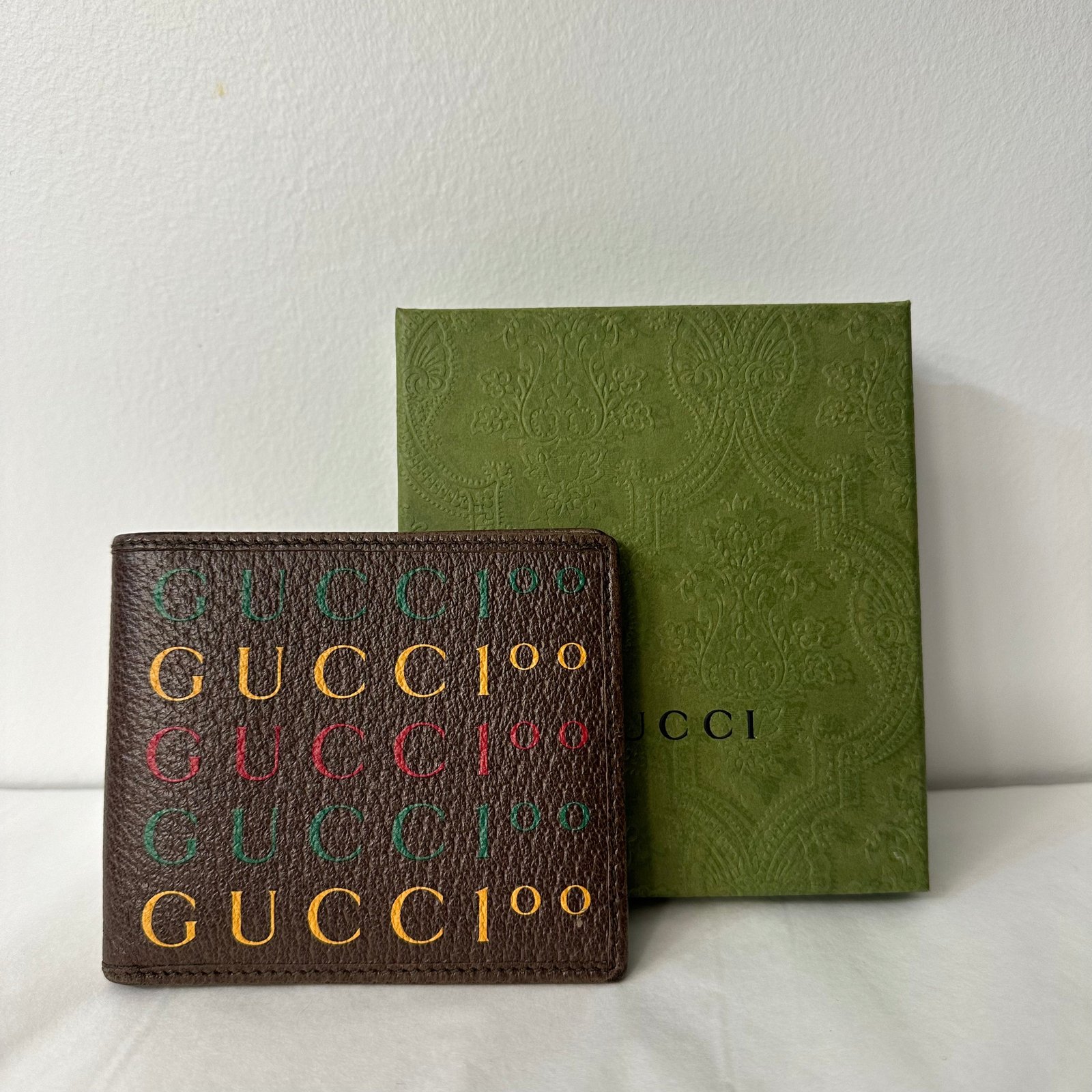 Portefeuille en cuir marron avec inscriptions Gucci édition 100 ans, édition limitée.