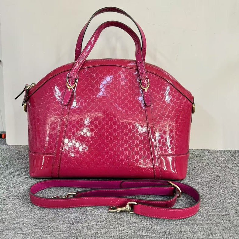 This Gucci Preloved Two-Way Pink Leather Satchel Bag is perfect for adding a pop of color to your collection of vintage Gucci bags. Crafted from glossy leather, it features the iconic GG pattern. The versatile piece comes with dual handles and a detachable shoulder strap for functionality. Inside, it’s lined with beige fabric, offering ample space for essentials. An ideal choice for those who cherish used designer handbags, exhibiting both luxury and style.