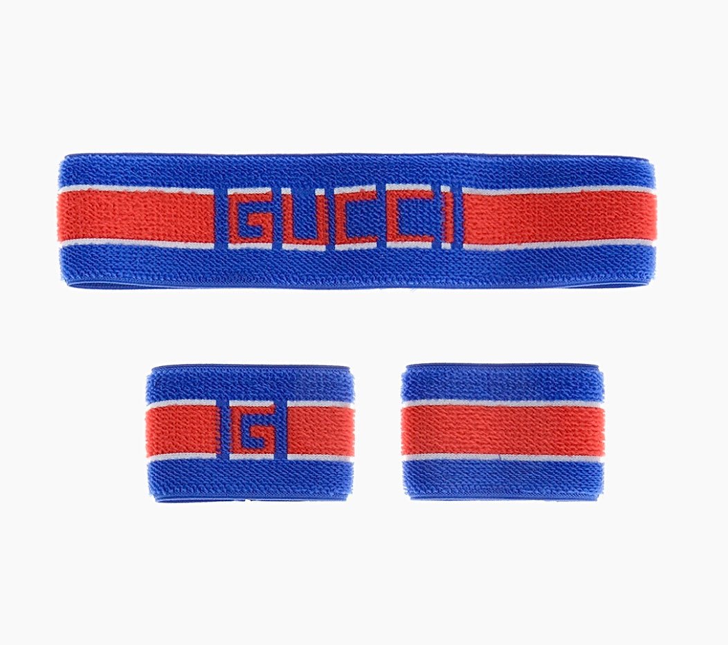 The Gucci Queen Heron Headband and Wristband Set in Blue is created from a polyester, elastodiene blend to create a stylish, functional band set. This band set comes with 1 headband and 2 wristbands, and features a soft textured exterior, the Gucci logo, and a thick red stripe against a vibrant blue base.