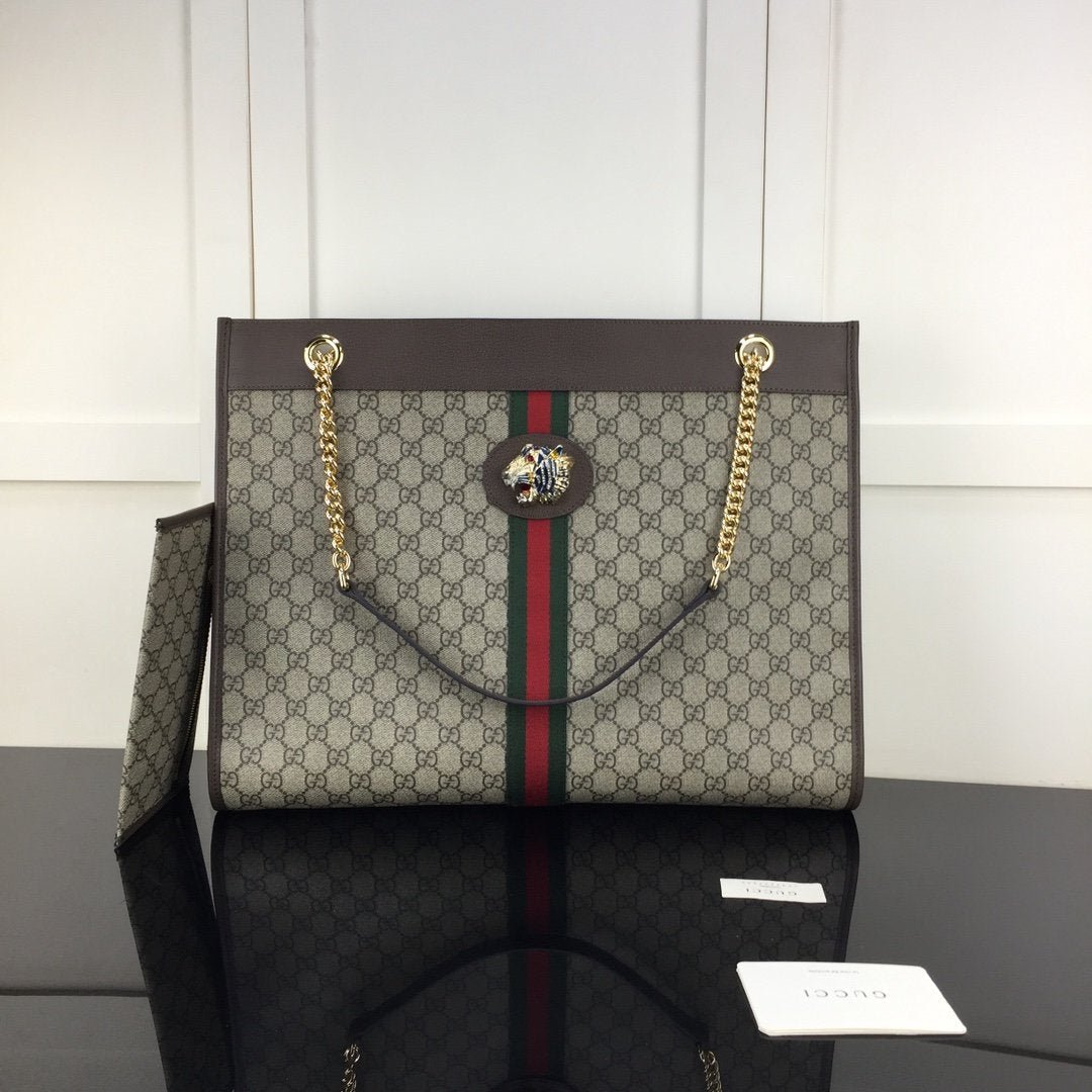 Gucci Rajah GG Canvas Tote Bag is has a brown leather trim and features a prominent crystal tiger head stud on the front, red and green web striping and gold chain link shoulder straps with brown leather shoulder pads.