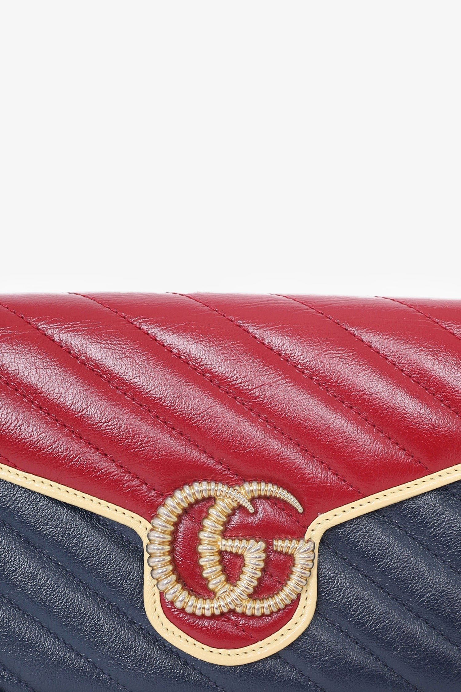 Gucci Red/Navy Quilted Marmont Wallet On Chain. Front fold-over flap with snap button closure. Bill fold pockets on front and back of interior. 3 interior sections with single zip closure pouch in the middle. 8 card slots on front and back of interior. Tonal stitching. Gold-tone hardware.