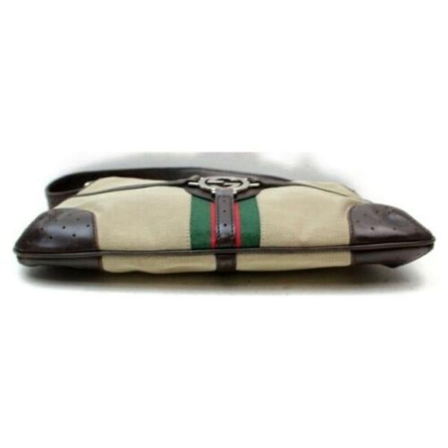 For sale is a Gucci britt reins blondie, dark khaki canvas and brown leather hobo style shoulder purse with a wide, single leather strap, magnetic snap closure, equestrian accents, red and green Shelly stripe and chrome GG center accent! It has the look of 1960’s mod styles from Gucci with a modern edgy twist that would be great used as your signature brown purse!