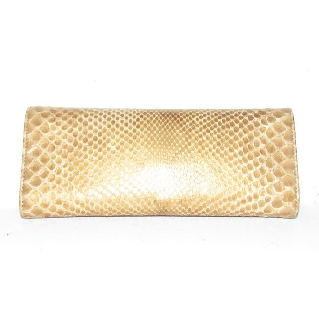 This purse is a rare style made with gold python skin leather! It is a long, rectangular shape with an envelope flap top. It has an extra large gold buckle accent, a gold arrowhead look accent engraved with ‘Gucci’ at the center, and a strip of python skin leather layered on top of the envelope top front!