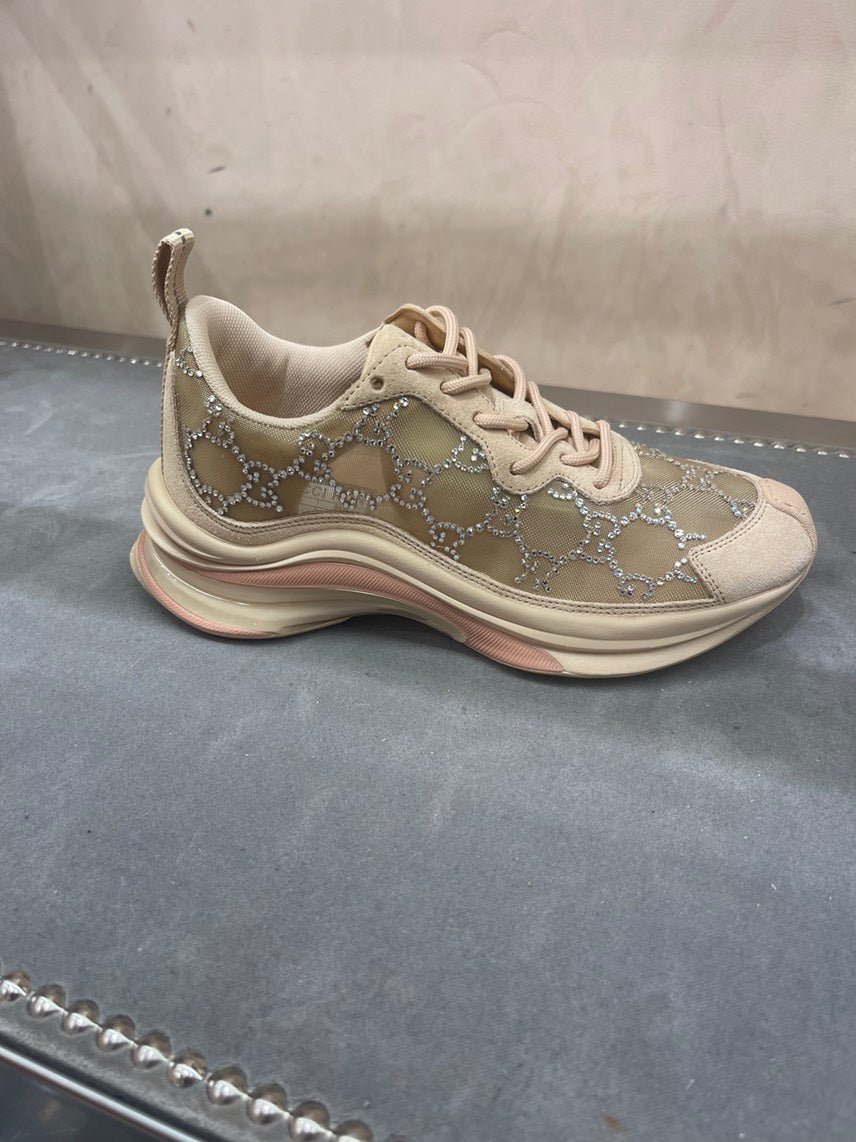 Step into luxury with the Gucci Run Crystal Sneakers in Beige. These Gucci shoes feature a stunning crystal embellishment on high-quality leather, seamlessly merging style and comfort. Perfect for anyone seeking unique beige designer shoes that elevate casual wear, this pair promises a fashionable upgrade. With a round toe and lace-up design, they ensure a secure fit for everyday elegance.