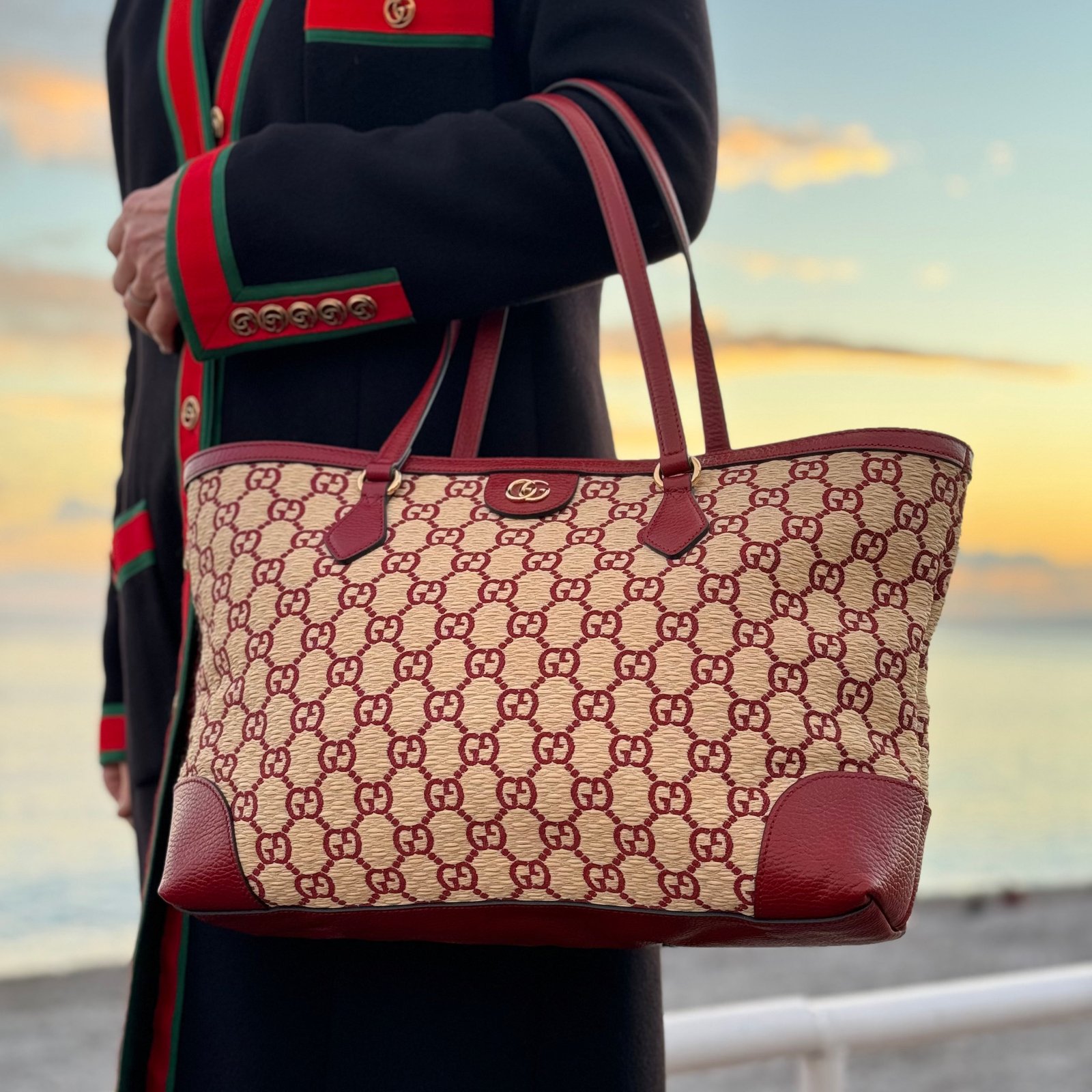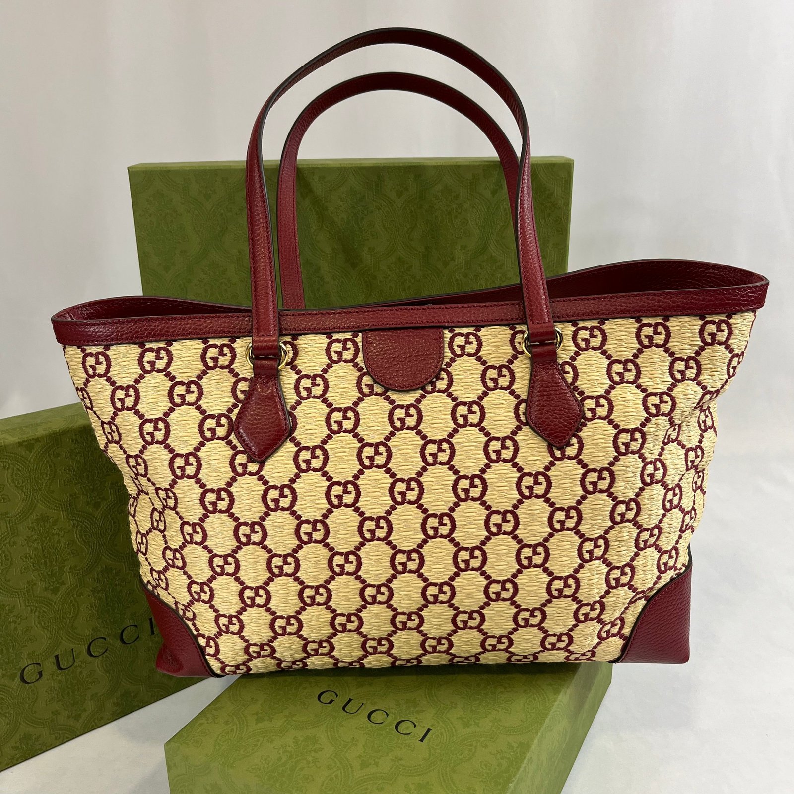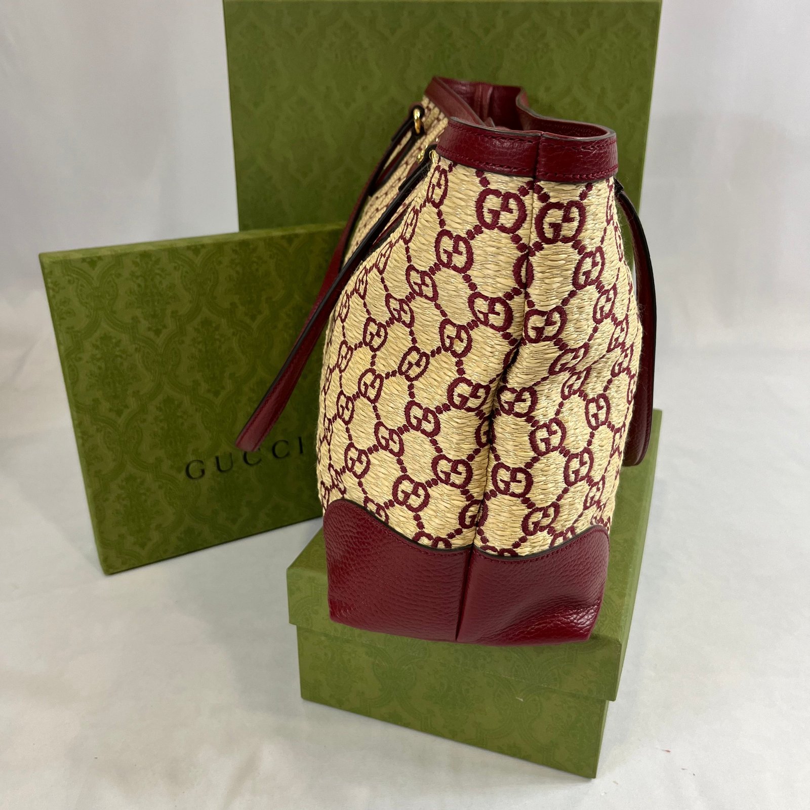 Sac cabas en paille tressée avec le motif GG et ses bordures en cuir. Très spacieux ; fermeture à bouton magnétique et poches plaquées. C’est un choix élégant qui mêle des nuances de couleurs intéressantes.