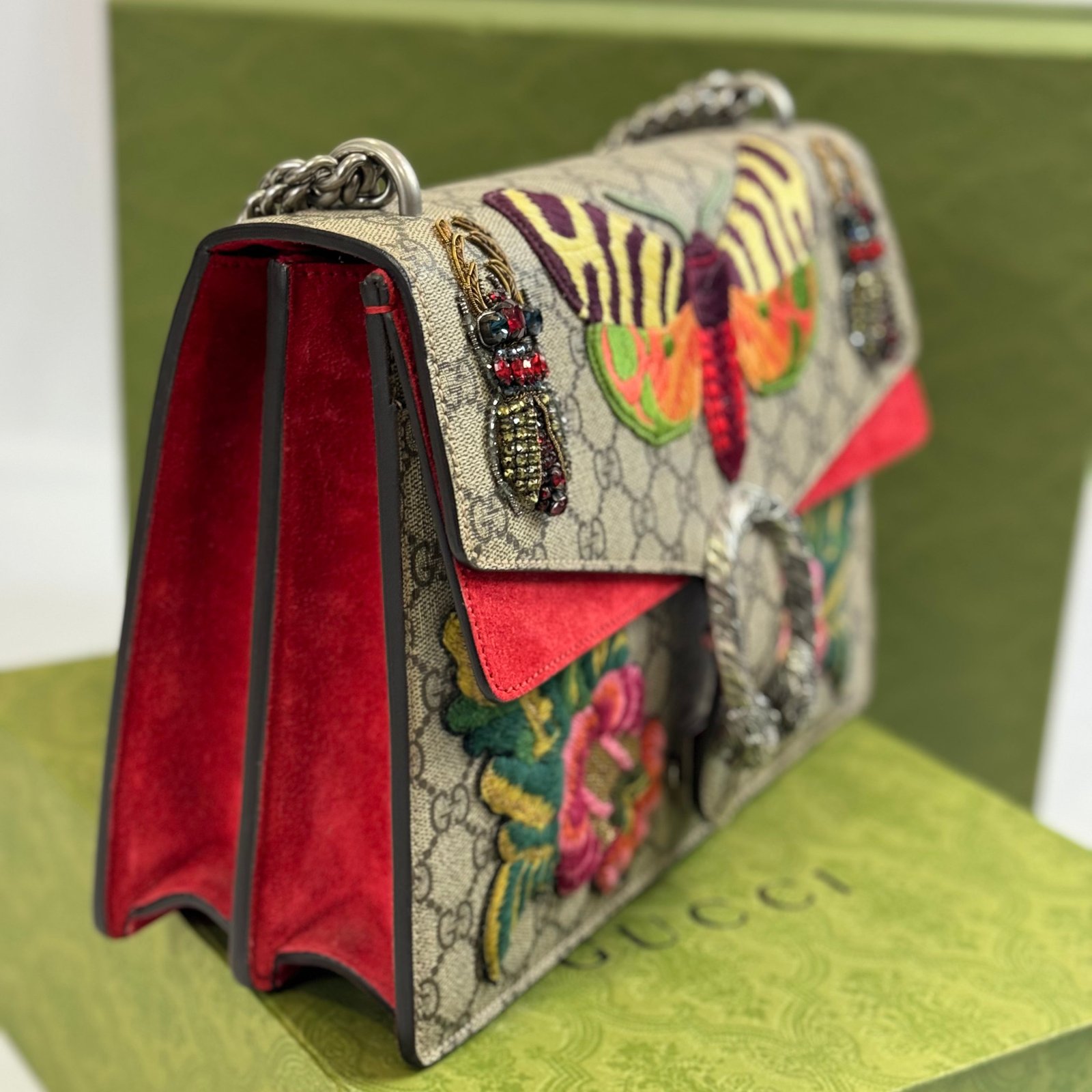 Dans sa version limitée, voici ce magnifique sac Gucci Dyonisus en toile suprême et velvet rouge orné de broderies et de strass