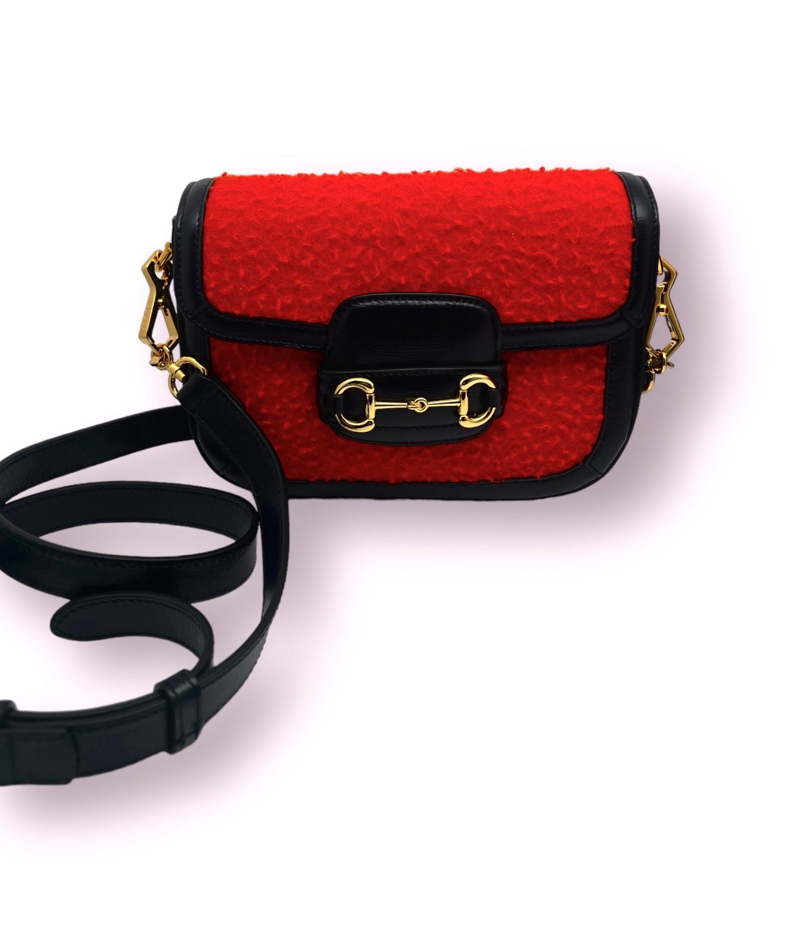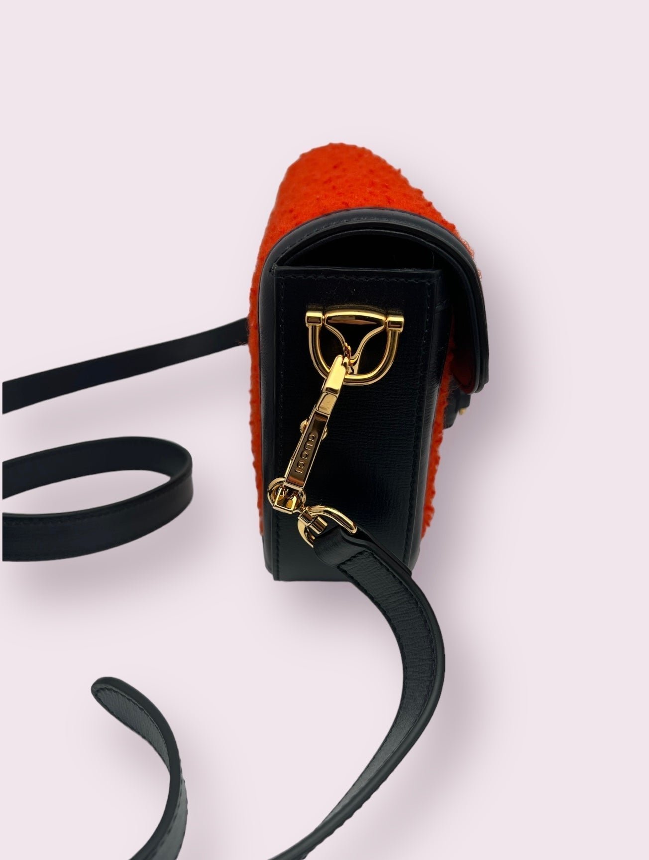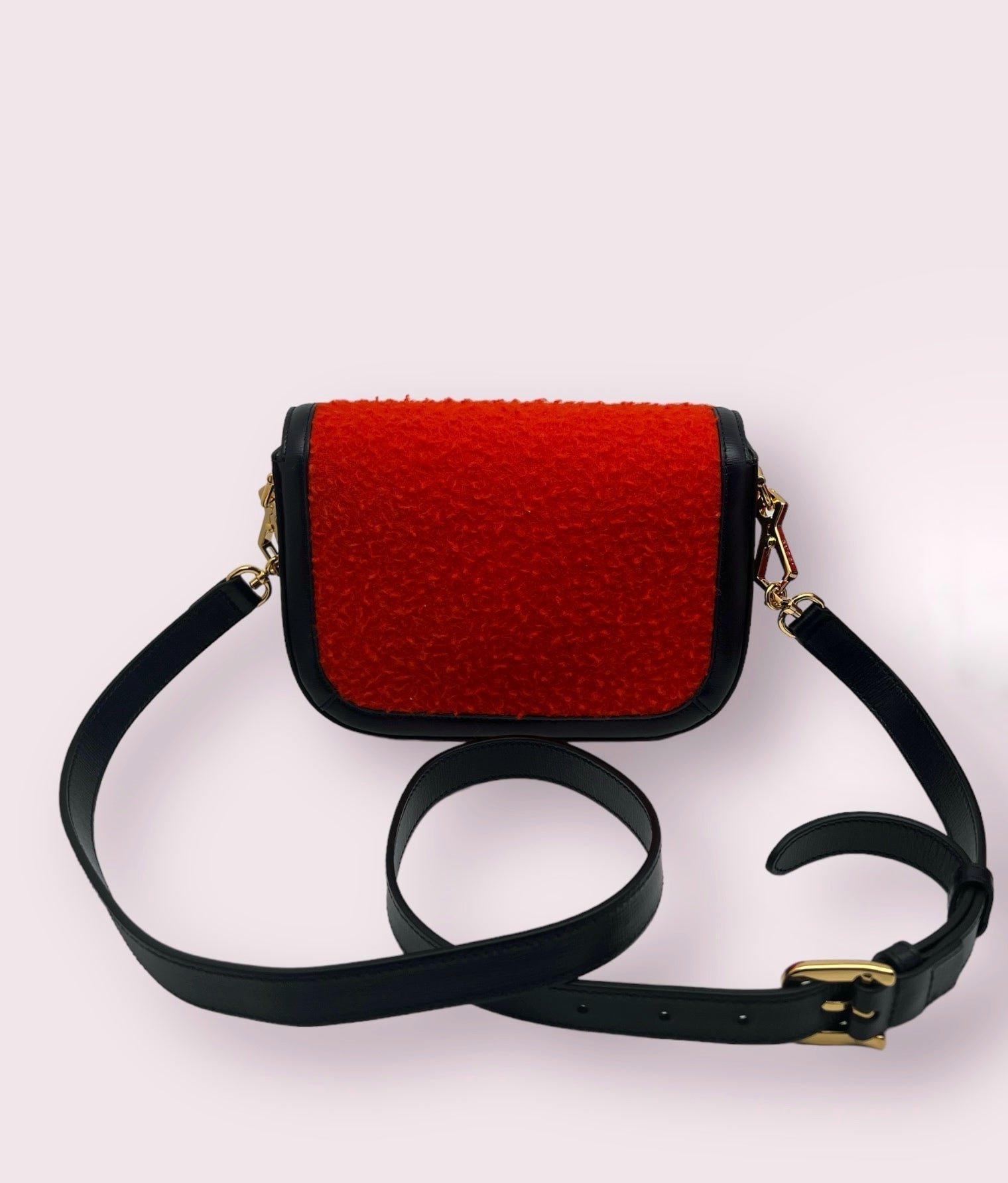 - Couleur : Laine rouge orangé vif, cuir bleu marine et intérieur beige en cuir