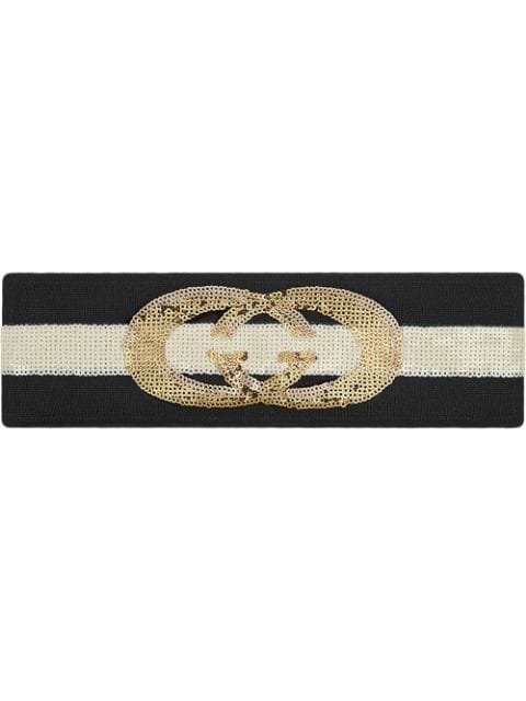 The Gucci Sequin Embellished GG Headband in Black and White is crafted from a cozy wool in Italy. This super soft headband features a plush, stretch fabric, white embellished stripe down the center, and a metallic gold-tone interlocking GG.