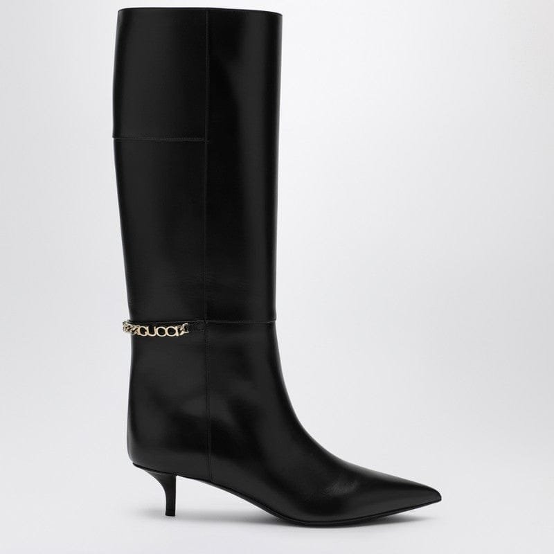 Black leather boot from Gucci featuring a high boot leg, a pointed toe design, a mid heel, a side zip fastening, a chain lettering detail and a leather sole. Heel 4,5 cm