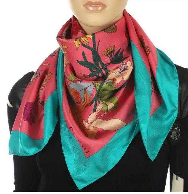 The Gucci Flora Gothic Print Silk Scarf in Pink is crafted in Italy from 100% silk. This square shaped scarf features a multicolor floral, gothic pattern on the front on top of a vibrant pink base, all of which is framed by a blue border.