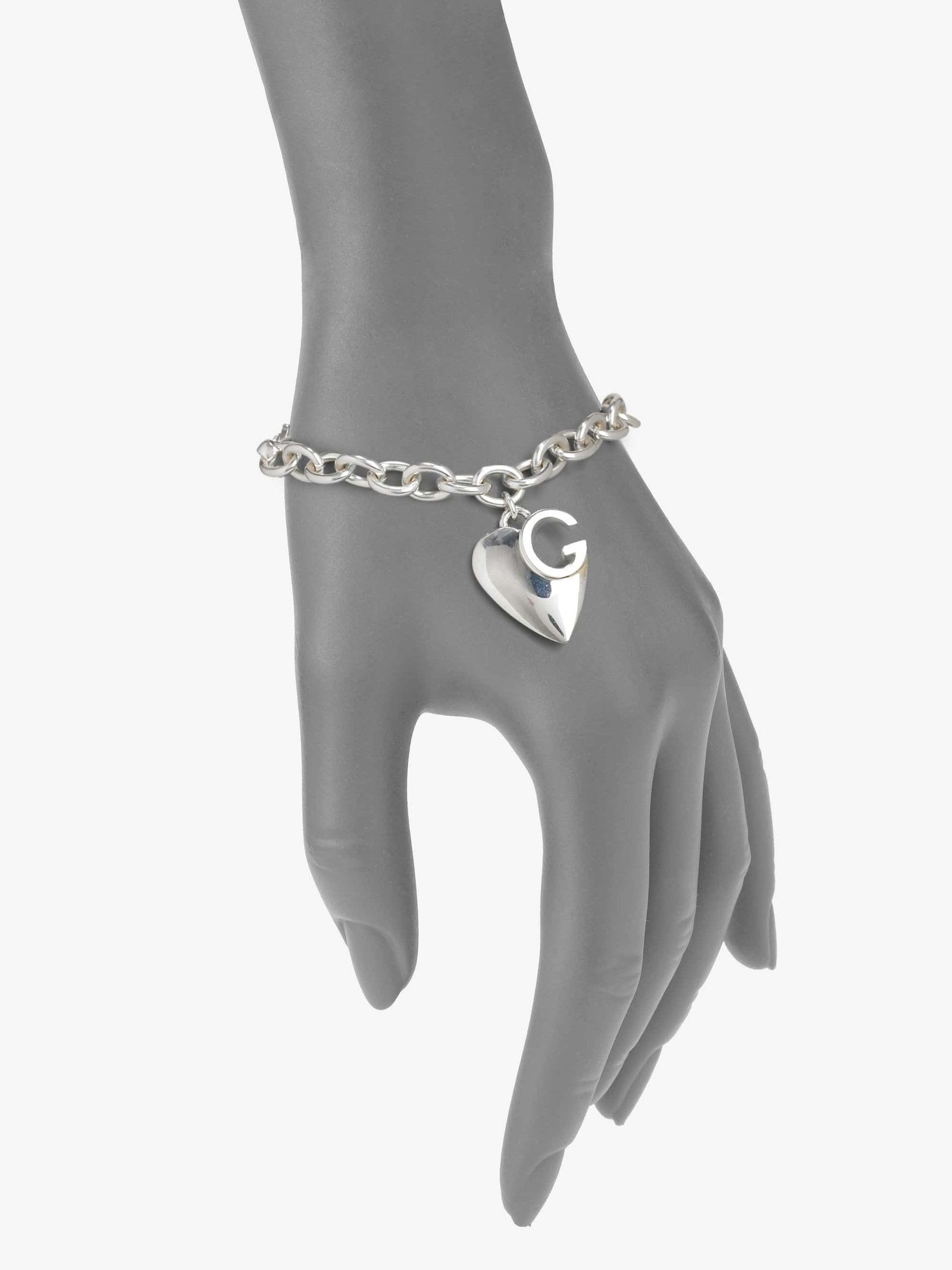 The Gucci Sterling Silver GG design Heart Charm Bracelet is crafted from polished sterling silver in Italy. This charm bracelet features a wide set chain style and a heart pendant with a carved out G detail.