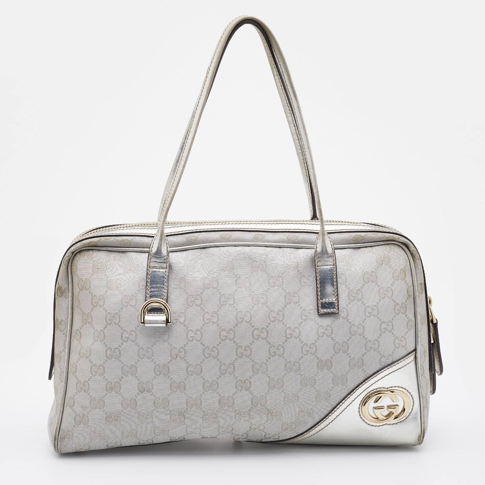 Gucci Silver GG Canvas and Leather New Britt Boston Bag