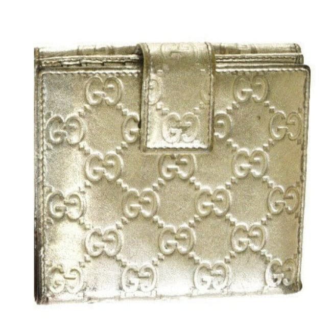 For sale is a Gucci, silver leather, medium size, wallet with an embossed Guccissima print, gold geometric design in hardware, accent with ‘Gucci’ engraved, change purse, and lots of card slots! This practical and great looking, wallet from Gucci is the only wallet you will ever need!