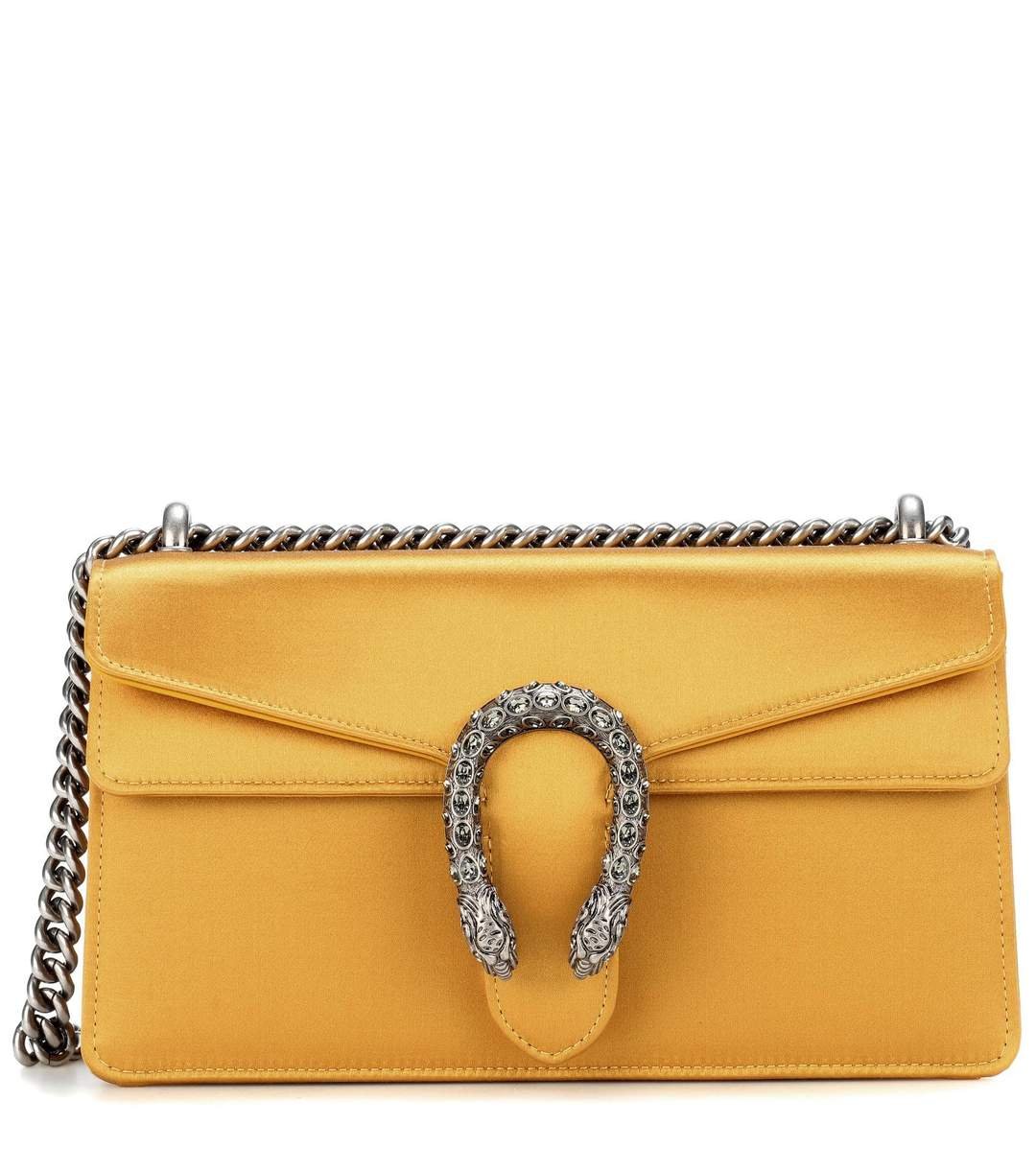 The Gucci Small Dionysus Satin Shoulder Bag in Celestial Yellow is a structured bag, made of gleaming blue silk and contrast suede interior. The piece features a silver-tone chain shoulder strap, a fold-over top with snap closure, an internal slip pocket and a signature textured snake buckle embellishment. With delicate rhinestones for a touch of sparkle, this item also includes a swatch so you can match your look around this magnificent accessory.