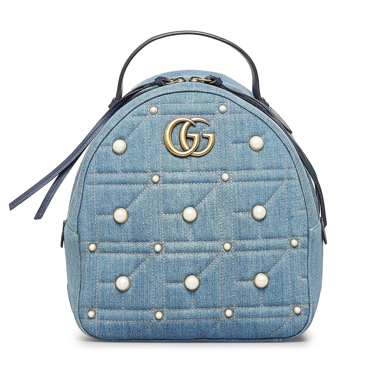 Introducing the Auth Gucci Small GG Marmont Pearl Blue Denim Fabric Backpack, a chic and versatile accessory for the fashion-forward individual. Crafted with high-quality denim fabric, this backpack exudes luxury and style. The iconic GG Marmont pearl embellishment adds a touch of sophistication to any outfit.