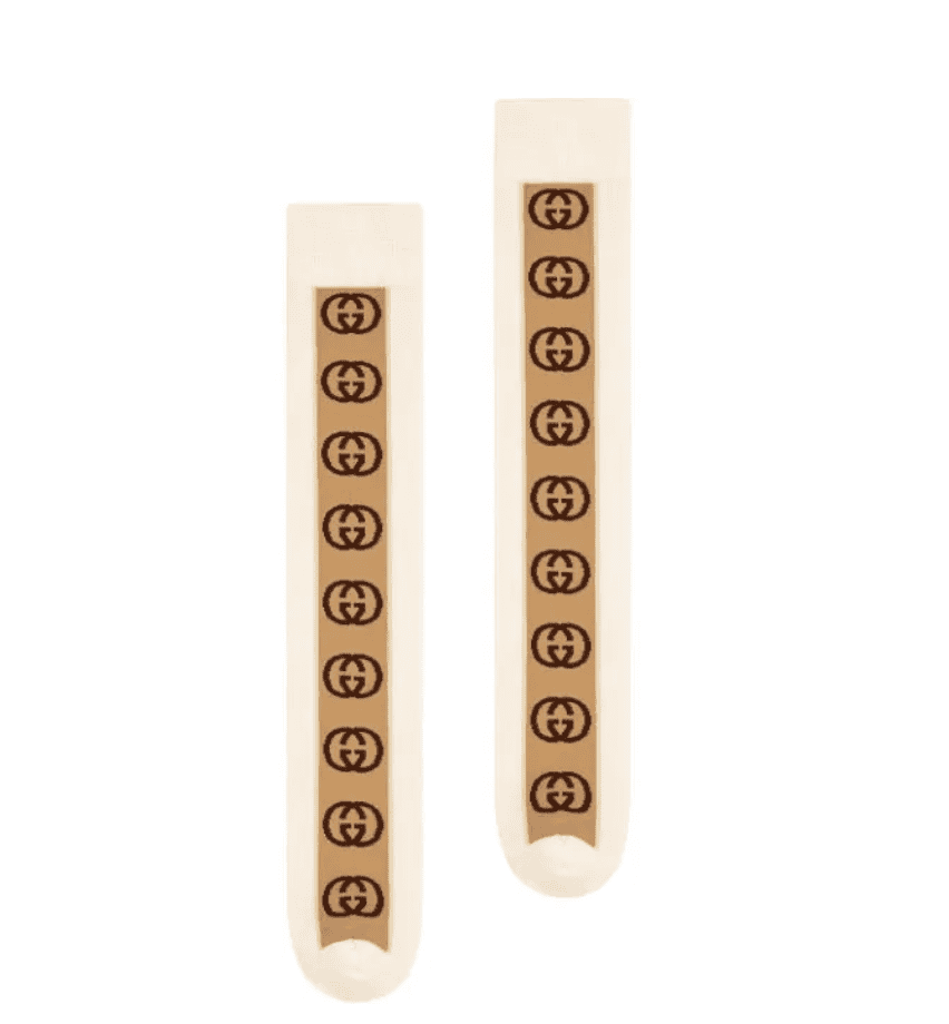 The Gucci Socks with Interlocking G Stripe In White and Beige are a soft cotton blend with a knit ribbed cuff. These white socks feature a beige and tan stipe with the interlocking G logo.