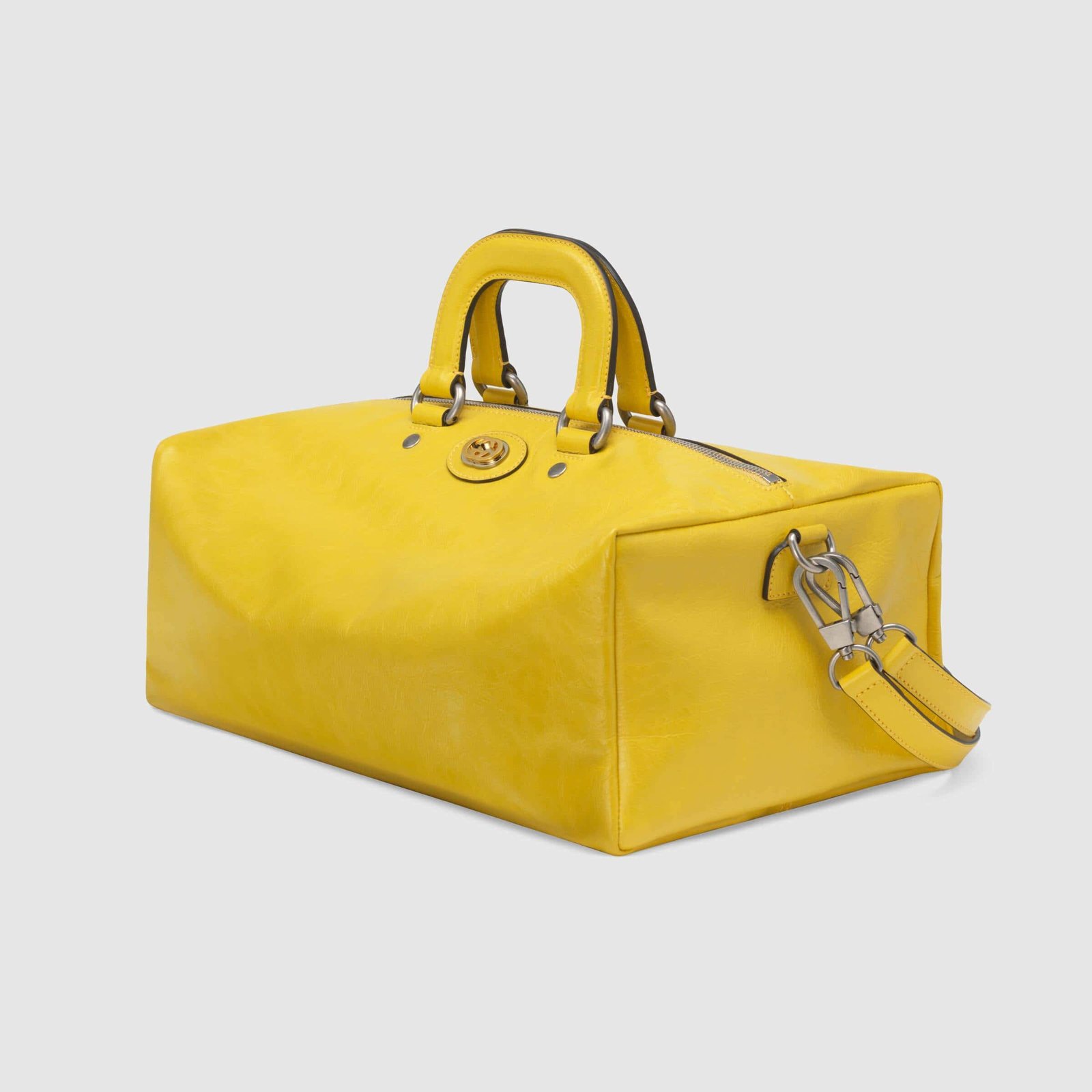 Defined by its soft yellow leather construction and two-toned Interlocking G detail, this backpack speaks to Gucci’s fascination with the idea of hybridization, combining multiple functions into one to create a multifaceted design. Equipped with an additional side top handle, the style can be as a long tote, while the shoulder straps can be doubled, transforming the backpack into a duffle. The leather is specially treated for a slightly effect that lends to its vintage appearance, recalling the ’70s era.