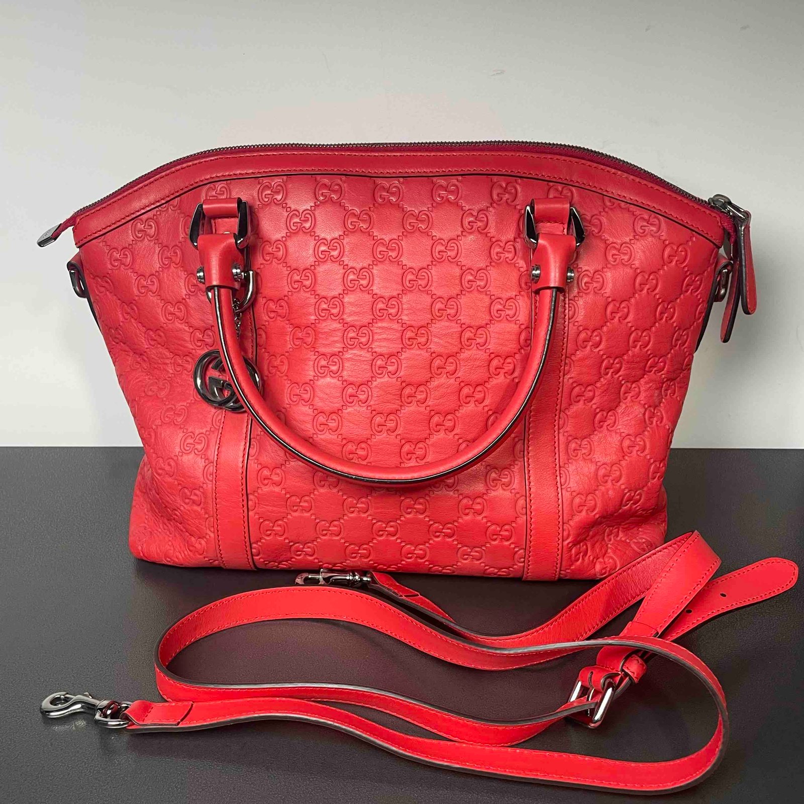 This is a pre-loved Gucci two-way bag, part of the iconic GG Marmont line. Crafted in luxurious red leather with an embossed GG logo pattern, this shoulder bag exudes elegance and versatility. It features a detachable strap for two-way styling and silver hardware, maintaining a sophisticated look. Ideal for women who appreciate high fashion and functionality.