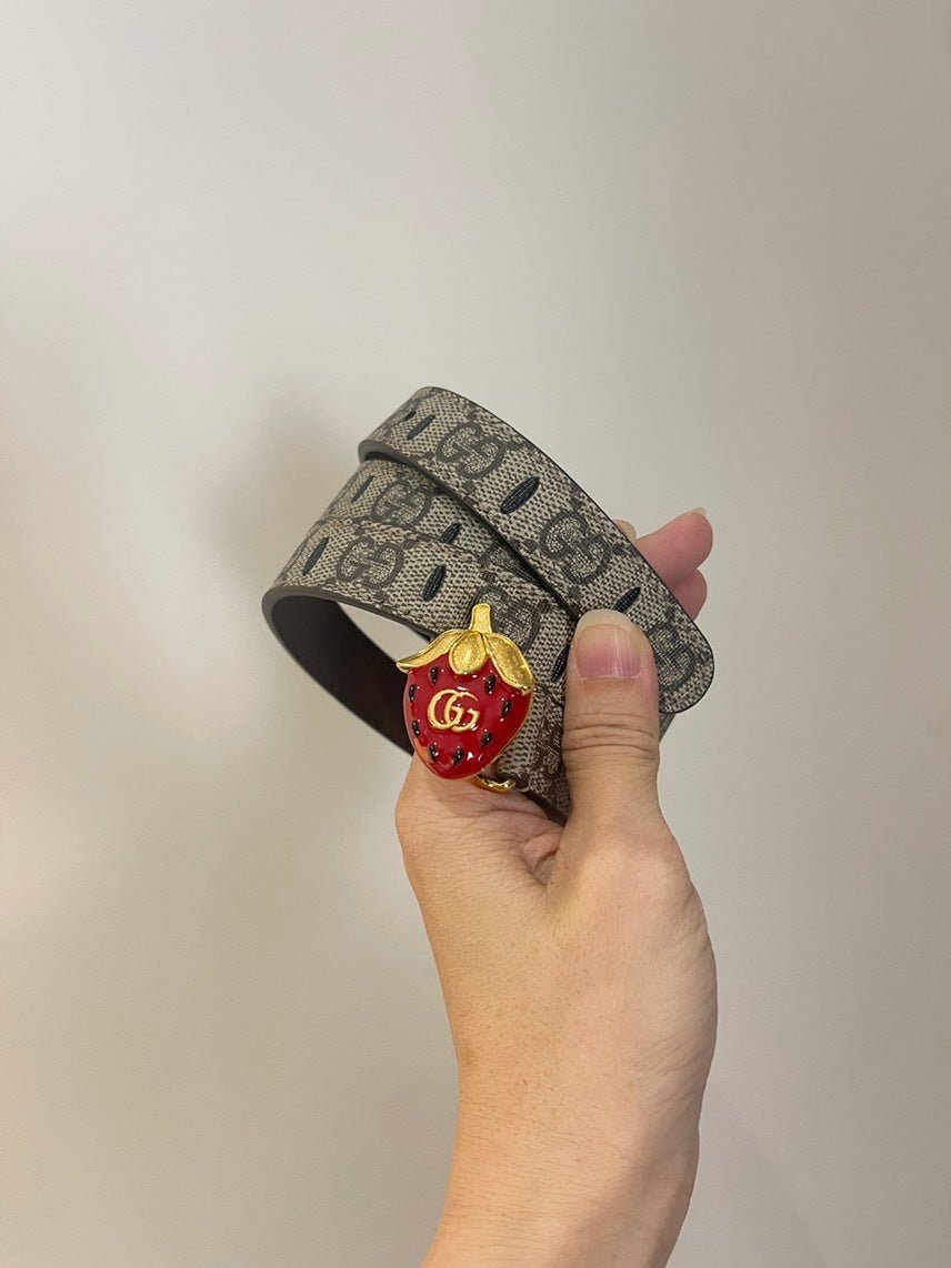 This is an used Gucci belt, featuring a standout strawberry buckle for a touch of whimsy and elegance. Crafted from beige canvas with the iconic GG pattern, this Gucci belt offers a chic and modern aesthetic. The adjustable size ensures a comfortable fit, making it a must-have fashion accent.