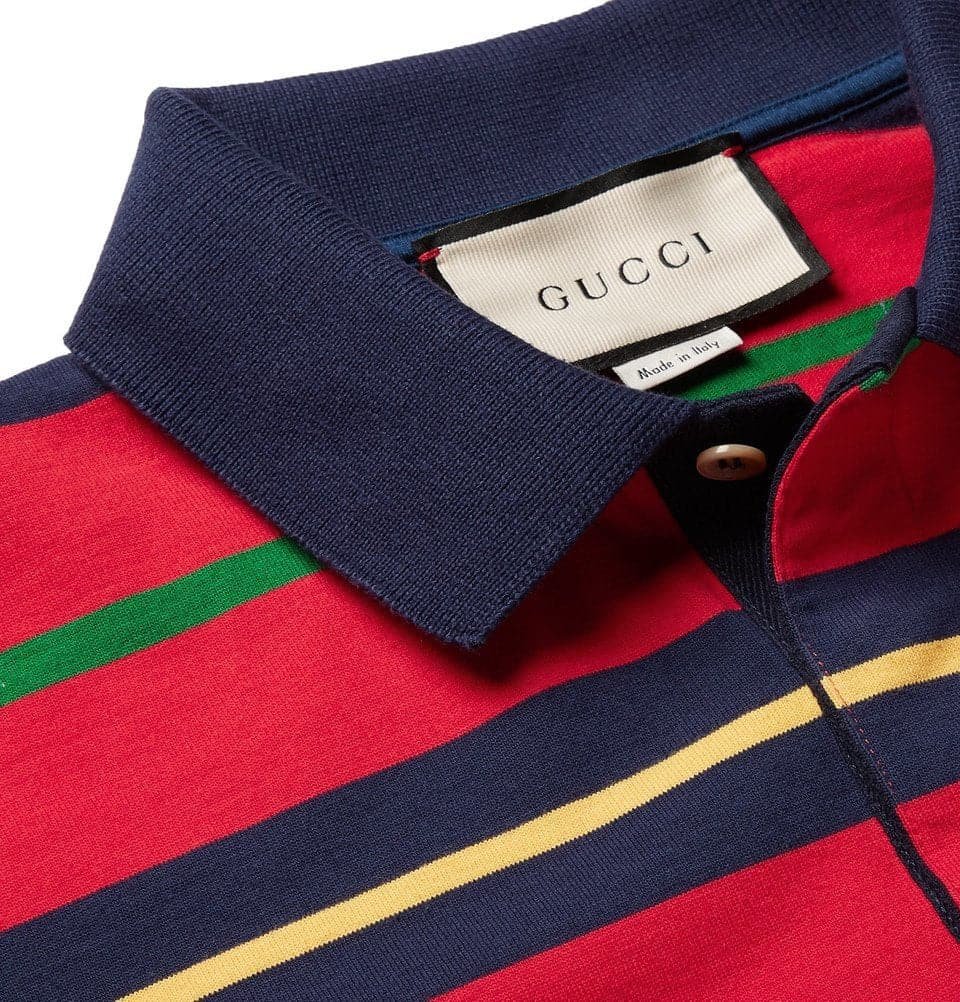 The Gucci Striped Long Sleeve Polo with Bee in Red is crafted of 100% cotton in Italy. This long sleeved polo shirt is designed with a stripped pattern and features a navy blue collar with a button up closure, and a rainbow embroidered bee.