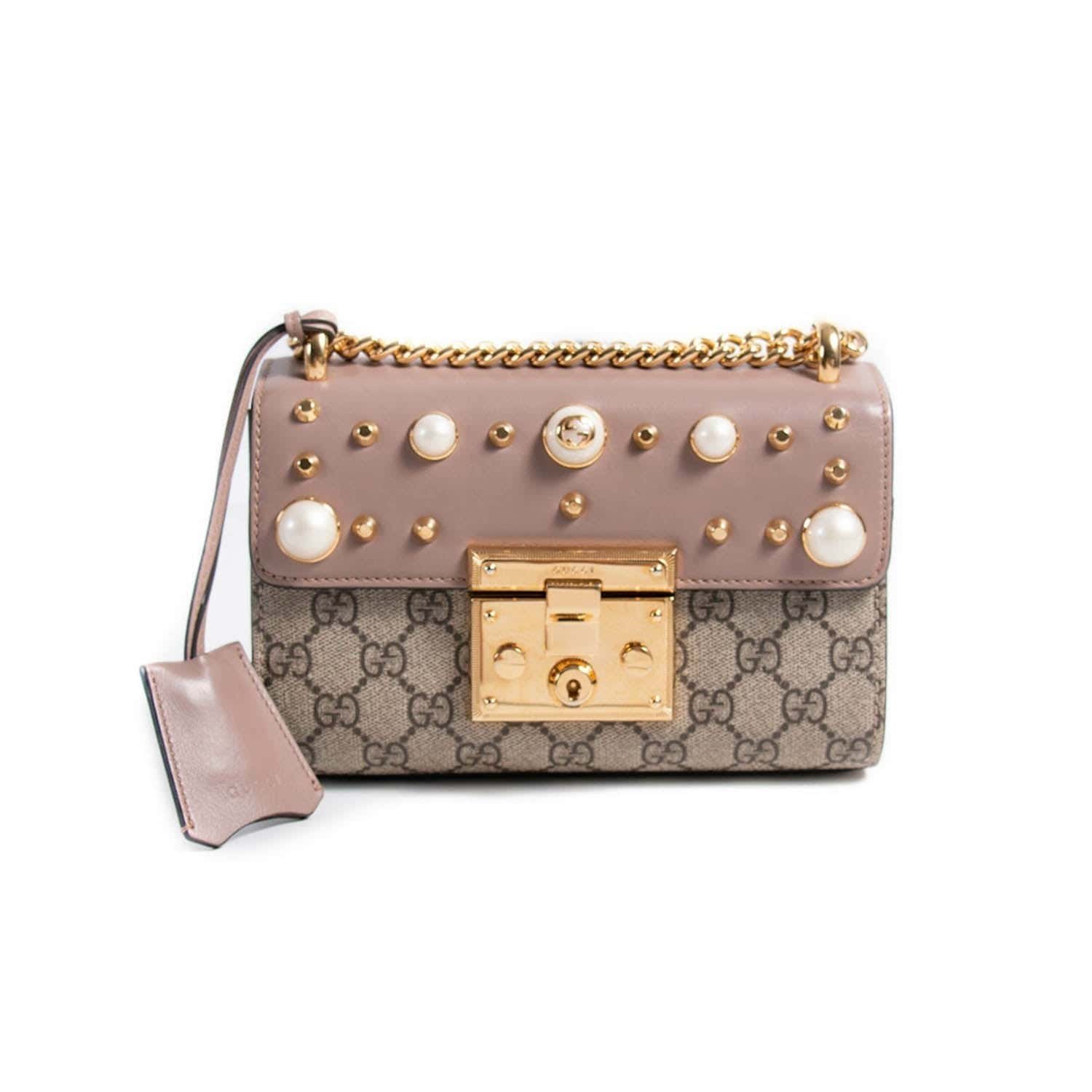 Details: Tan Soft Leather with Brown GG Coated Canvas / Gold-Tone Hardware / Chain-Link Shoulder Strap / Studs and Pearls Embellishment at Front / Pink Fabric Interior Lining / Single Slit Pocket at Inside / Flap Closure with S-Lock