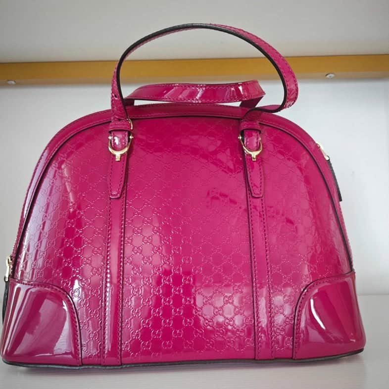 This is an Gucci GG Satchel, crafted in luxurious pink patent leather with an embossed GG pattern. The elegant bag features dual leather handles in matching pink and gold-tone hardware. The top zipper opens to reveal a spacious pink fabric interior, ideal for carrying your essentials in style. Accompanied by the original dust bag, this is a perfect choice for those who appreciate iconic Gucci design with a vibrant twist.