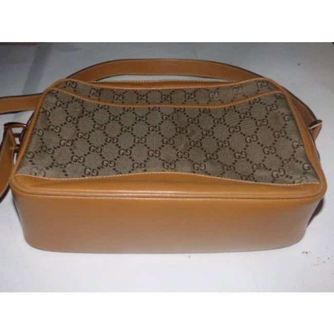 The bag is made of a taupe shade of brown fabric with the large G logo design throughout and camel colored leather. The bottom, top, sides, piping and strap are all leather. There are exterior pocket that snaps close on both sides and it has a unique, dual zip top, each for a different compartment. This purse can hold all of your daily needs and would work year round with any outfit!