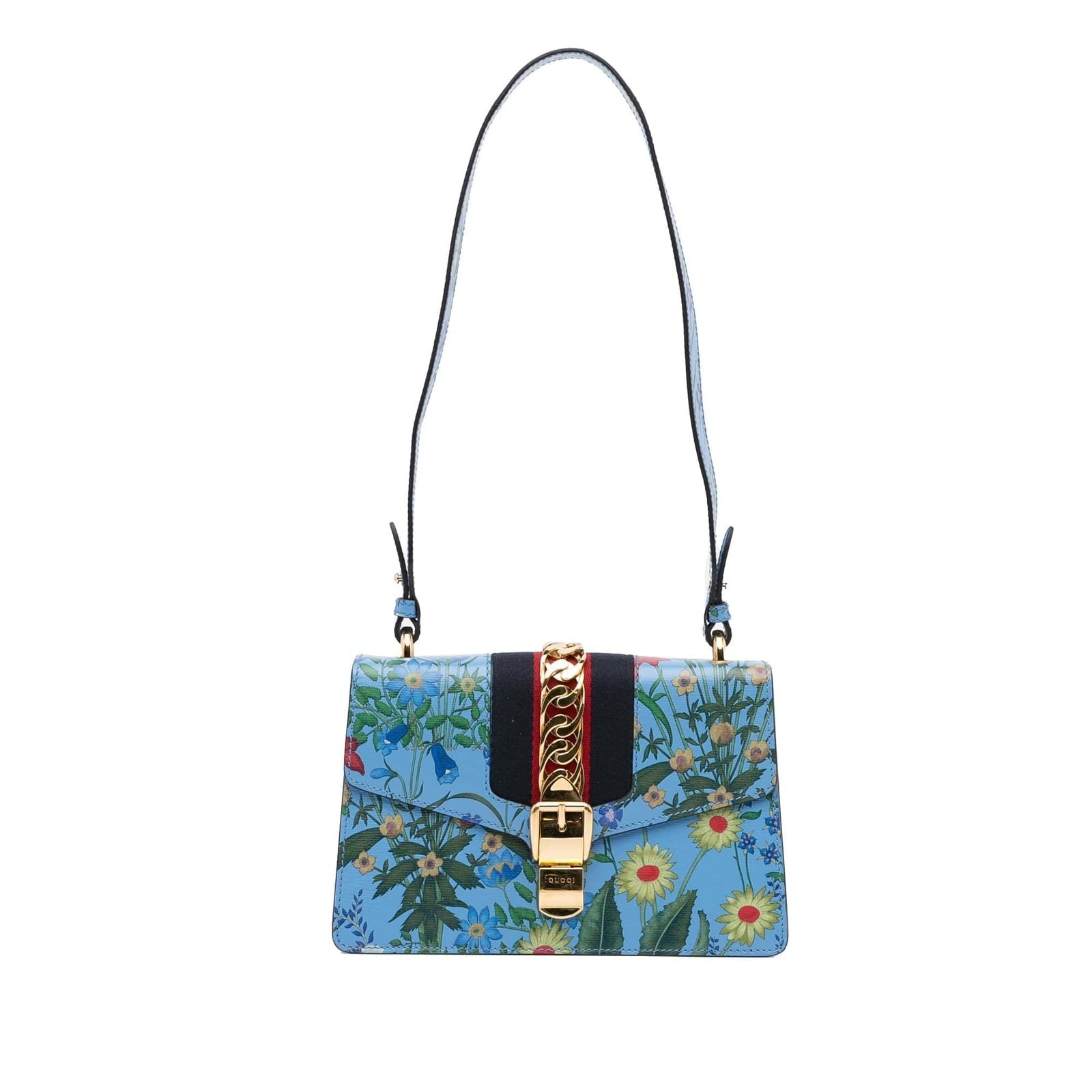 This elegant Gucci Sylvie shoulder bag is made of blue leather with floral print, striped woven straps, gold details, leather shoulder strap and zipper and slip pockets inside.