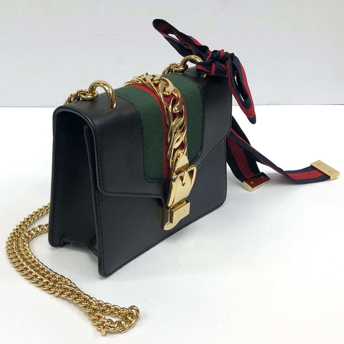The Sylvie bag in a mini structured shape with a chain shoulder strap and grosgrain Web bow. The nylon Web is embedded under the leather and decorated with a gold-toned chain and buckle. Made in our smooth, classic leather.