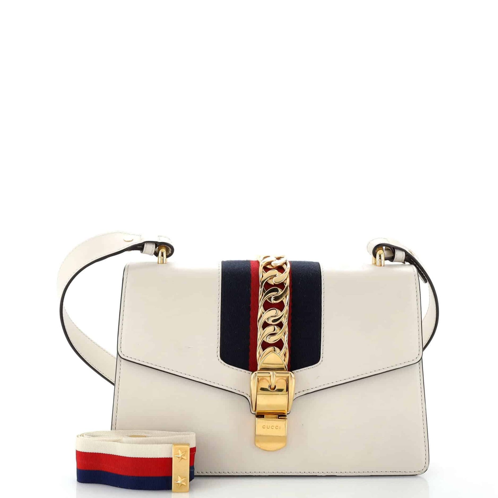 Elevate your style with the Gucci Sylvie Shoulder Bag Leather Small. Crafted in Italy, this iconic bag features a sleek design with the signature Web stripe and gold chain detailing. The compact size makes it perfect for both day and evening looks. The adjustable leather strap allows for versatile wear, while the flap closure ensures your essentials are secure. Make a statement with this timeless piece from Gucci’s renowned Sylvie collection.